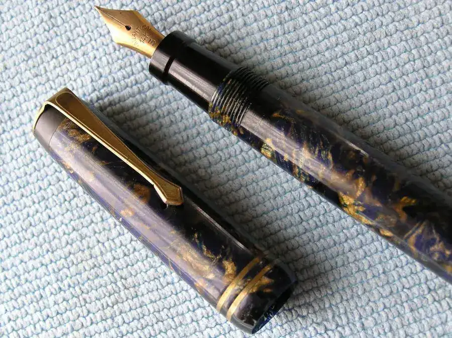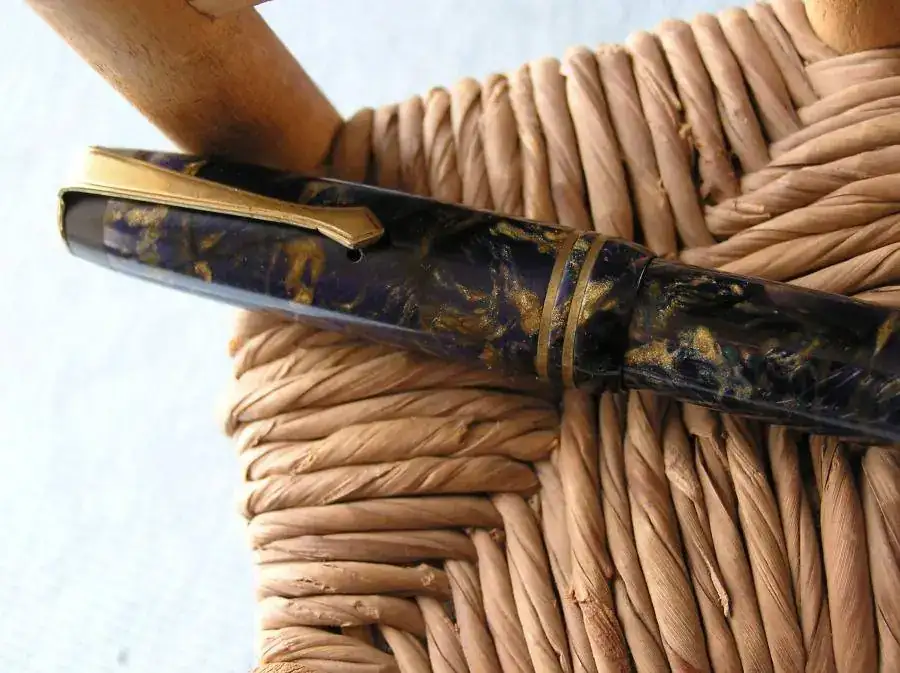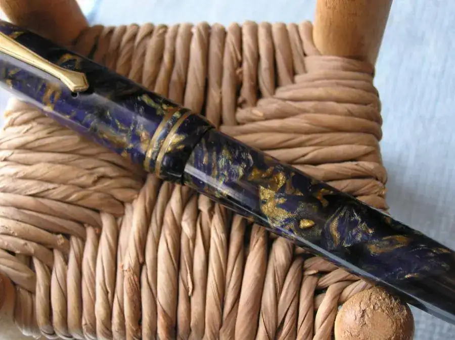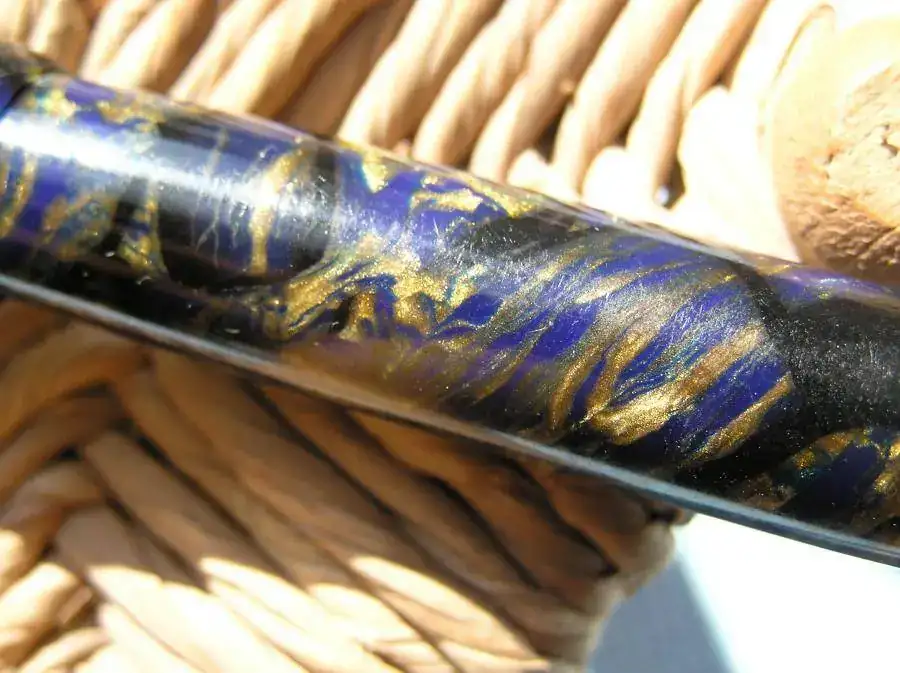 Es una pluma grande, 13,50 cm. cerrada, con un color realmente espectacular y difícil de reflejar mediante fotografías de aficionado pues el color oro tapa completamente el azul cobalto.