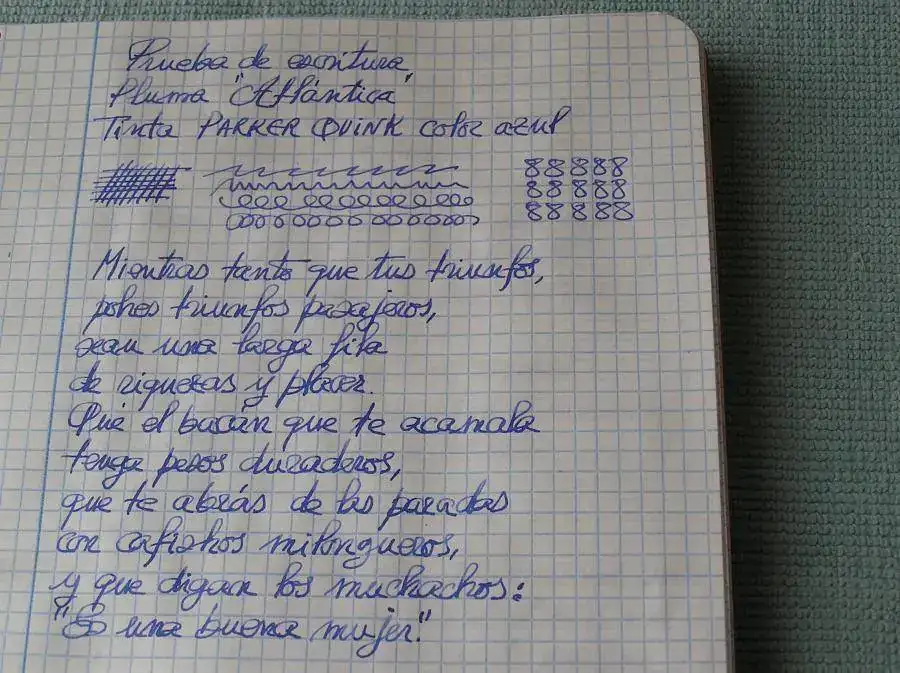 El plumín es extraordinariamente flexible, hasta el punto de requerir de un poco de práctica para poder escribir con él. Lleva la inscripción Atlantica 14K 3.