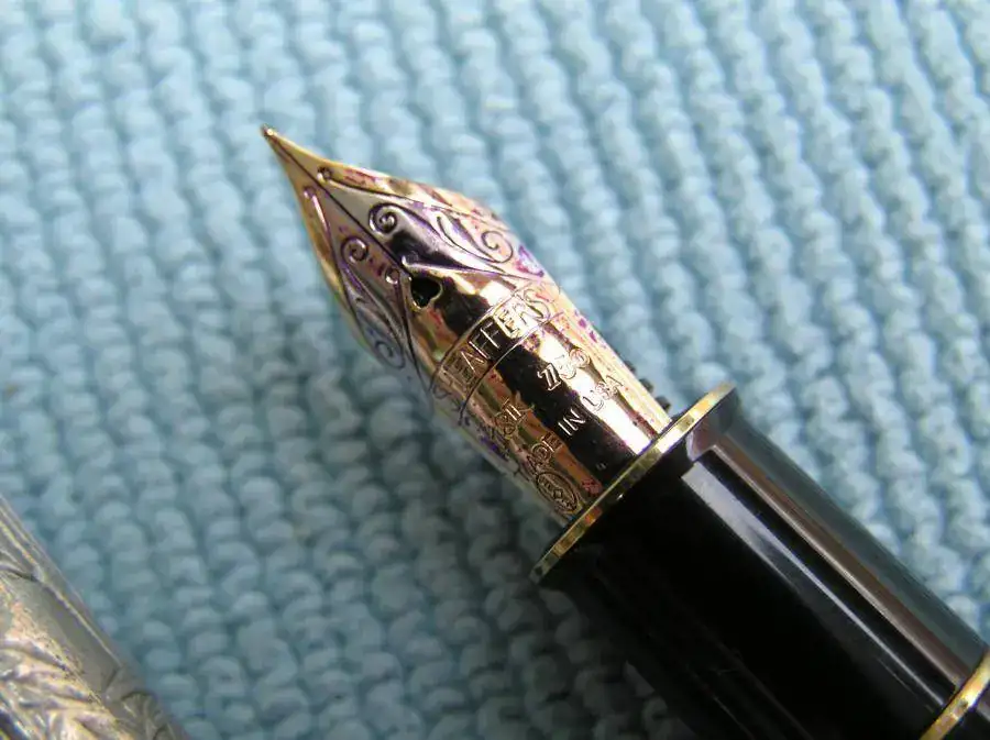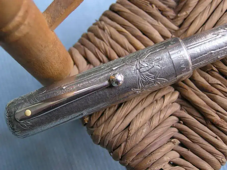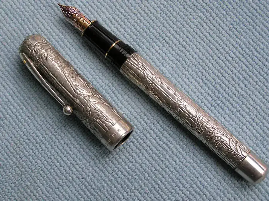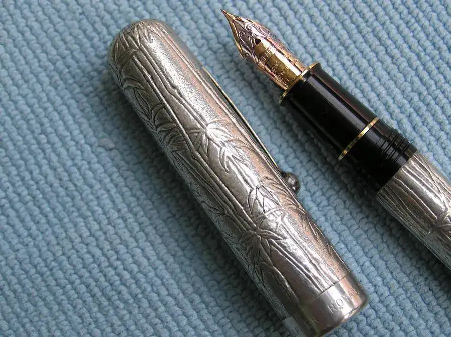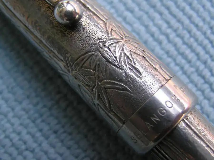 Esta pluma es una Edición Especial de Sheaffer resultado de su colaboración con la compañía asiática Royal Selangor Pewter Factory, radicada en Malasia, que es especialista en la manufactura del estaño. Lleva una decoración de hojas y tallos de bambú en relieve y el plumín es de 18 quilates. Este es extrafino y algo flexible.