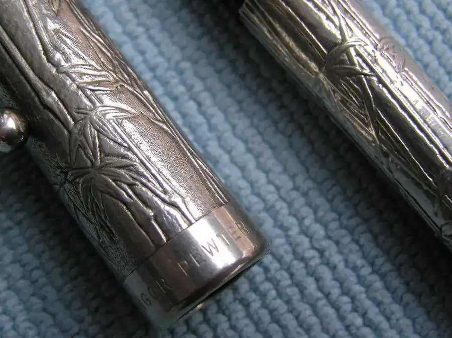 Esta Sheaffer Royal Selangor Bamboo está hecha de Peltre. El Peltre es una aleación compuesta en su mayor parte por Estaño con pequeñas cantidades de cobre para darle dureza, plomo pare darle color azulado e incluso algo de antimonio. Dependiendo de las proporciones existen diferentes tipos de peltre.