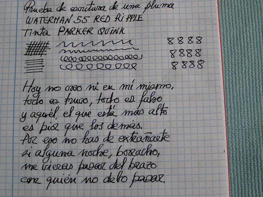 La pluma que presento es una Waterman 55 Hard Rubber Red Ripple. Es una pluma de ebonita de color Red Ripple y su número de identificación (55) corresponde según el código de Waterman a una pluma de carga por palanca (Primer 5) con un plumín de tamaño 5 (Segundo 5).