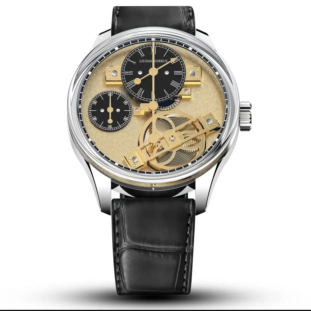 Liudas Norkus es un relojero autodidacta. Este es su primer reloj y el dial va a estar compuesto de 44 partes, todas visibles, todas pulidas a mano y chapadas en oro. No hay fotos aún del dial, porque se lo está guardando y próximamente lo mostrará, pero el reloj se sabe que es un regulador, con movimiento ST3600 modificado, es decir parte del clon de Unitas hecho por Sea Gull el cual modifica con piezas hechas por él para añadir la complicación de regulador en dos subdiales elevados con puentes fabricados por el. Es decir el reloj tiene bastantes piezas hechas en su taller artesanal