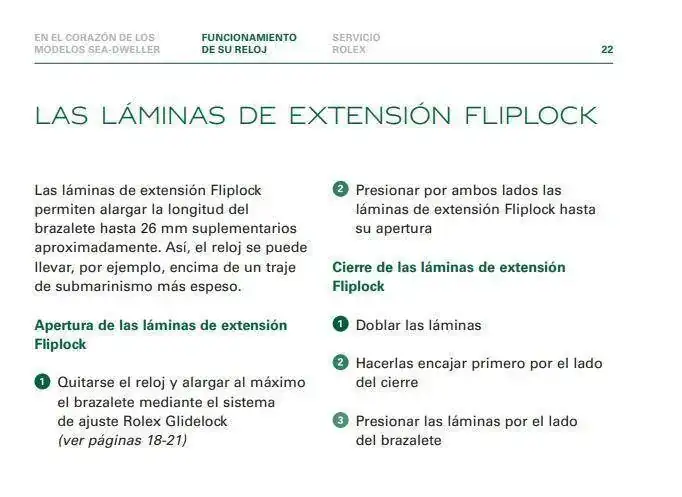 Gracias compañero por tu magnífica explicación.Rolex quitaron las láminas de extensión Fliplock de 26mm cuando sacaron al mercado el Deepsea 136660 y de paso dejaron de ofrecerlas también con el SD43 126600. Ya no aparece en los manuales de instrucción. Aquí pongo un extracto del manual que venia con mi SD43 del 2017, explicando el funcionamiento de las dichas láminas.