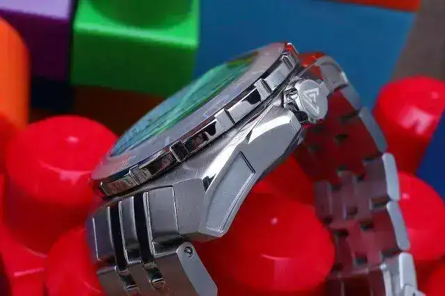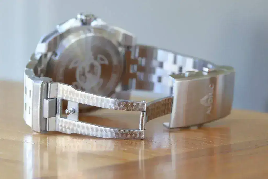 - SS 316 L pulsera con hebilla de buzo y extensor. Enlaces finales sólidos en la pulsera ajustada con tornillos en los enlaces para facilitar el dimensionamiento. 22 mm en las orejetas y 20 mm en la hebilla.