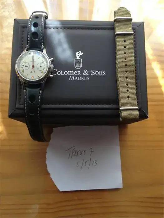 . Tiene 37,5 mm de caja sin contar corona. Maquinaria Seagull de 20 piedras calibre 2901, cristal mineral reforzado. El dial es de color beige. Viene con su nato de origen, sin estrenar y una correa racing muy bonita que le puse yo, que le queda de cine, nueva también, vamos, una puesta nada más. Pues eso, si hay alguien que no le importe que esté grabado, el reloj es suyo por 125 euros gastos de envío incluidos. Viene con su caja exterior e interior. La documentación no la encuentro, pero puedo deciros que la garantía, expiró hace dos meses. Aunque la casa (colomer) diga que la garantía es de por vida, es de dos años. Ahora las pésimas fotos. Quien quiera más, que las pida.