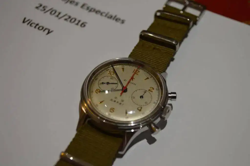 Vendo por falta de uso este magnífico crono SEAGULL 1963, reloj que me ha dado muchas satisfacciones. Modelo de sobra conocido por este foro. El reloj esta usado tiene una raya en el plexi debido a una caída, tiene una parte del pegamento despegado de la esfera a las 9 y la aguja del segundero del cronometro con una pequeña desviación, ver fotos, pregunte a mi relojero y me dijo que por menos de 20 € lo dejaba como nuevo, yo no lo arreglo ya que no lo uso. Procede de la Relojería Ancora comprado a principios de 2013. Lo vendo con toda su dotación incluyendo: