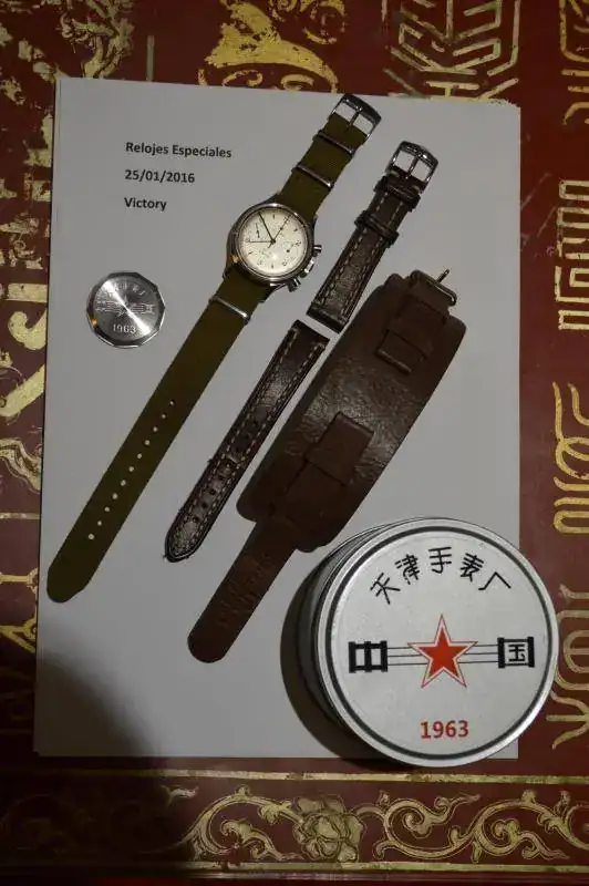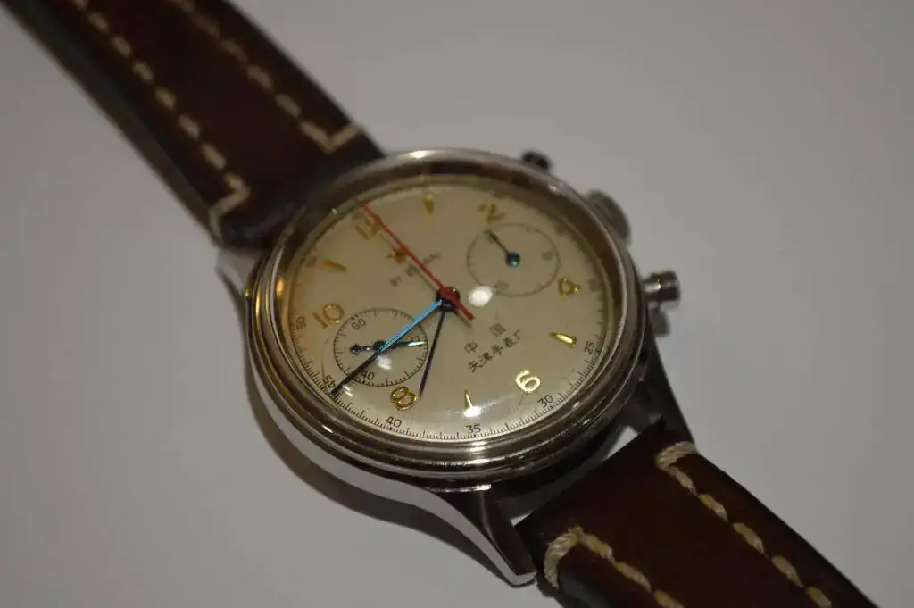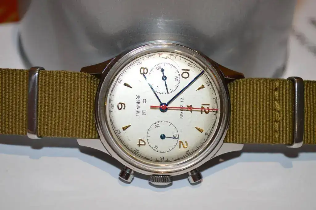 - Esfera con agujas azules y trotadora roja, con la leyenda 21 zuan, China y Tianjin fábrica de relojes (en caracteres chinos)