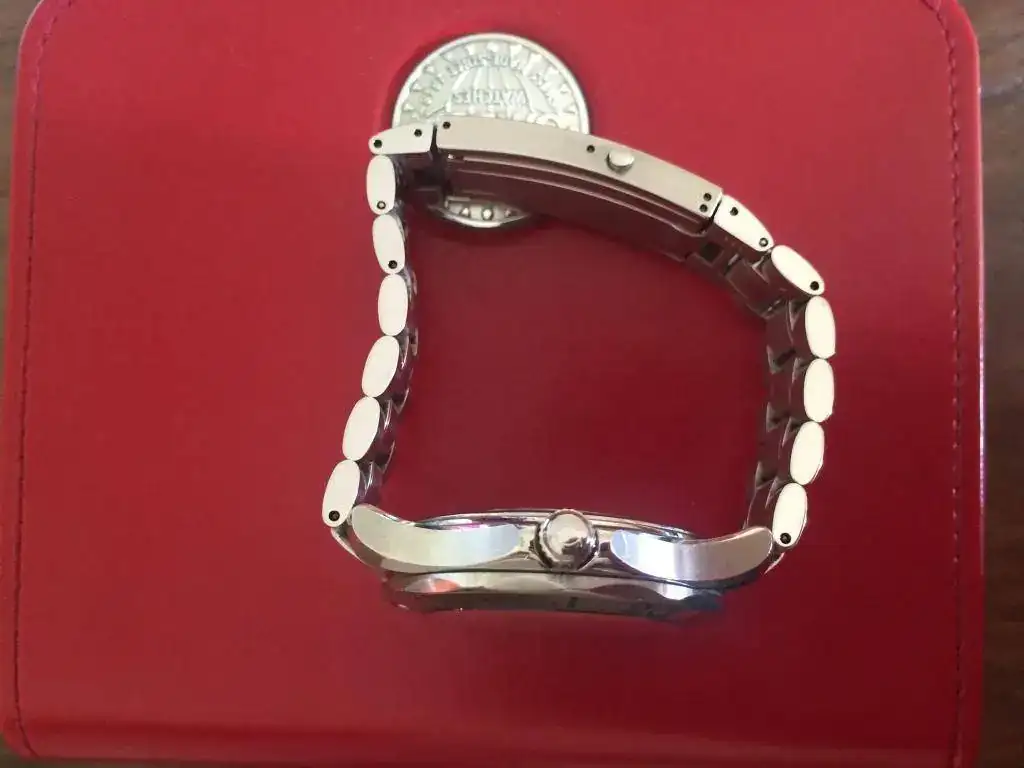 Modelo automatico reserva de 44 horas ,acabado rodiado,estanco a 300m con valvula de escape de helio , caja y armis de acero.