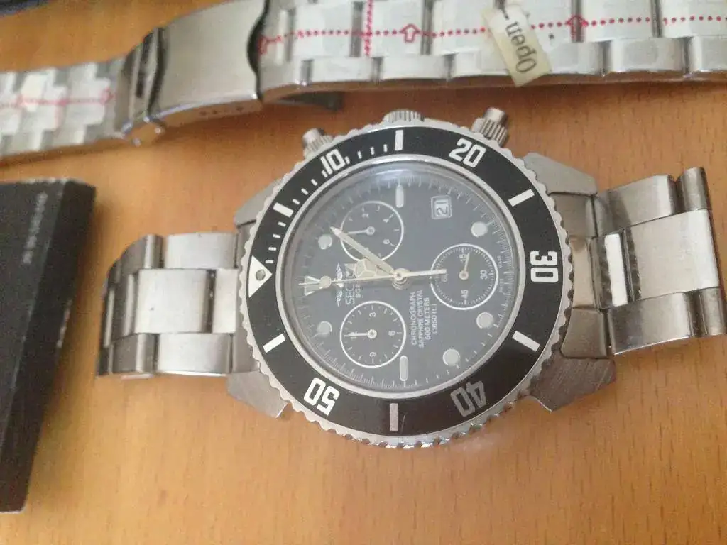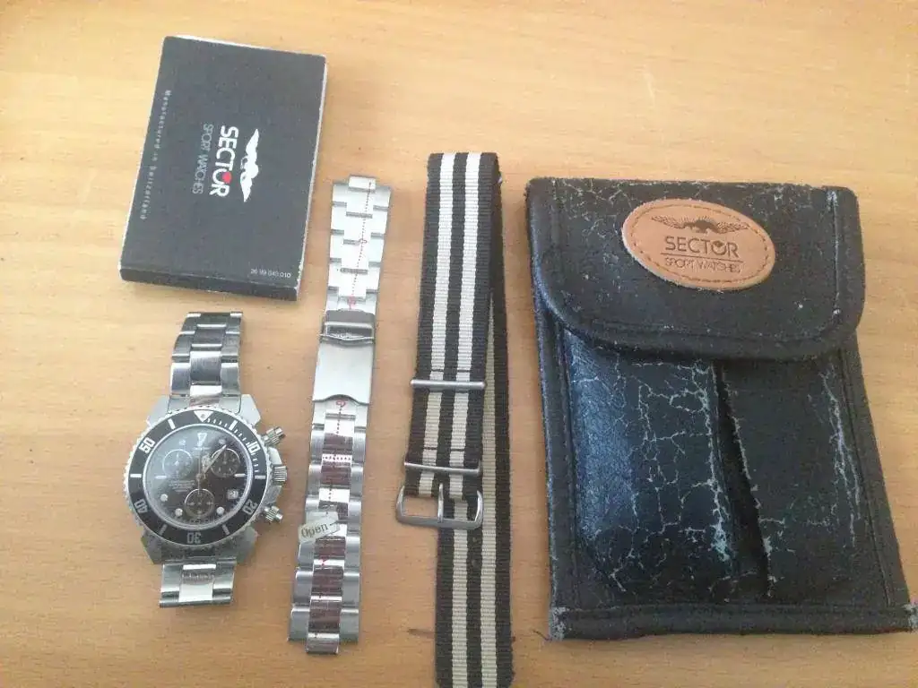 Hola compañeros,otro reloj que sale por la limpieza de la caja,este lleva 2 años sin salir de la caja. Magnifico y especial Diver 500M chrono de la casa Sector es el modelo SGE 500M Golden Eagle. He sido su único propietario desde el año 1991 que lo compré en Andorra. Es un reloj Diver que aguanta 500M de profundidad, con pulsadores y corona a rosca, tapa trasera a rosta también. Tiene armis de acero usado y otro de recambio completamente nuevo que costó mas de 80€. El reloj tiene una medida de 40mm de bisel y unos 44 con pulsadores y corona. Tiene un estilo Sub muy bonito la verdad.