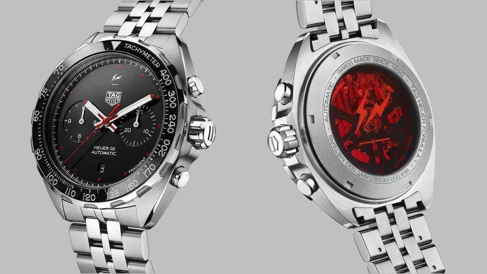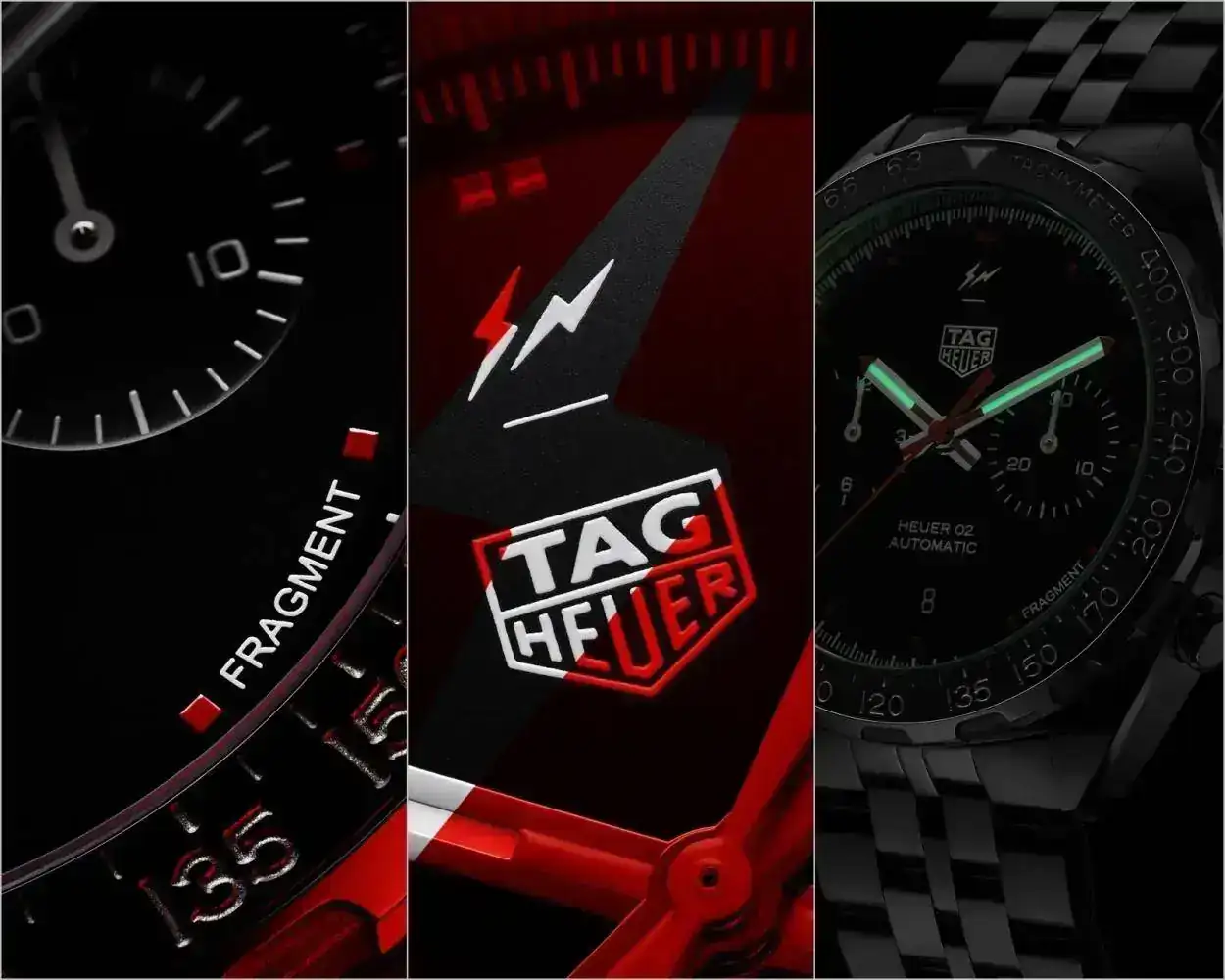 Fujiwara depura al máximo los elementos esenciales de la arquitectura del reloj, enfatizando la escala taquimétrica del bisel y despejando la esfera de cualquier adorno superfluo. La esfera opalina negra cuenta con dos contadores negros en relieve a las 3 y a las 9. La esfera negra contrasta con las inscripciones y logotipos en blanco, incluido "FRAGMENT" entre las 4 y las 5 en punto, y una ventanilla de fecha simple a las 6. Los únicos contrapuntos de la composición de alto contraste son los índices y la aguja central lacados en rojo. En el fondo de la caja, la arquitectura de los dos contadores del movimiento de manufactura propia Heuer 02 está parcialmente oscurecida y es aún más perceptible y llamativa gracias a una ventana circular de cristal de zafiro también rojo. Cada pieza está grabada con un número único de edición limitada del 1 al 500