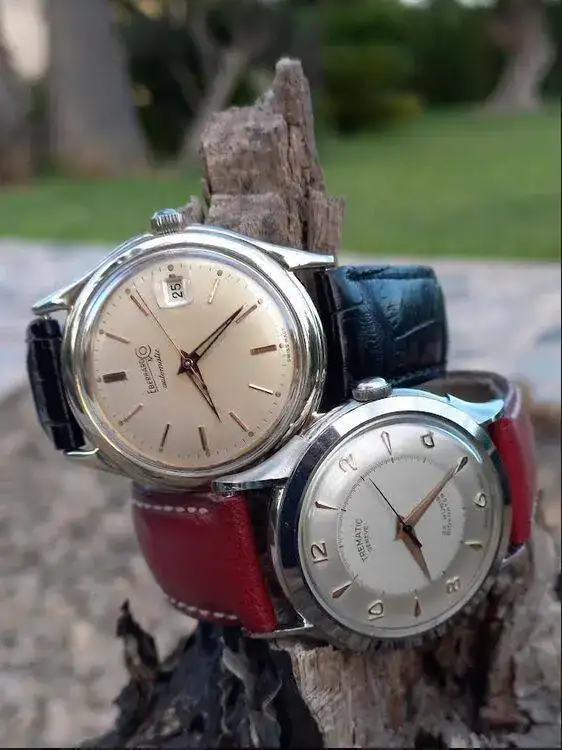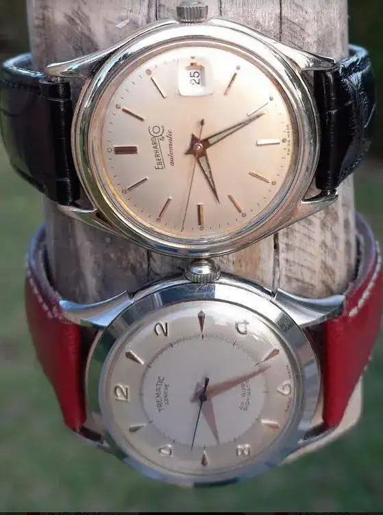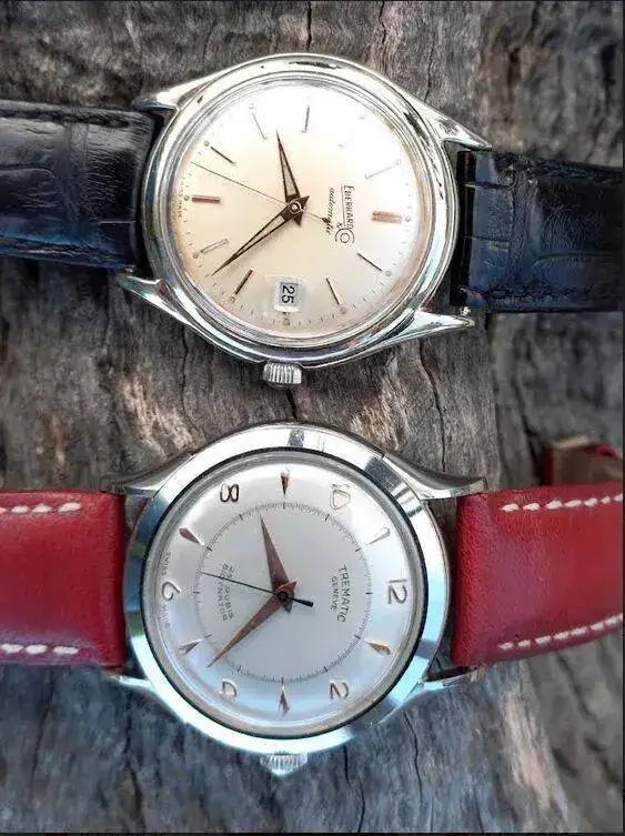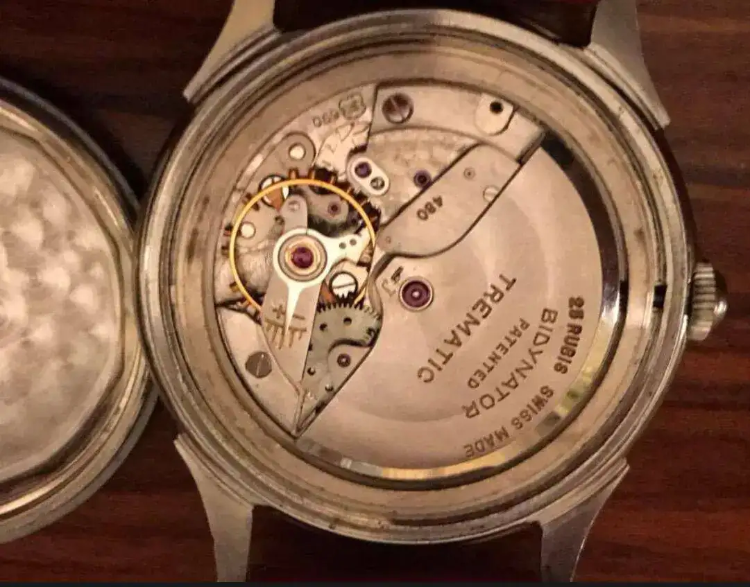 Ambos relojes llevan el calibre FELSA 690 BIDYNTOR y son del 1960. Uno es el EBERHARD GRAN LUSSO y el otro el TREMATIC 502, 36mm y caja de rosca central. Los movimientos solo tenian una revision, el EBERHARD hace tres meses en Conze Rolex, el TREMATIC despues de lo encuntraron en una caja, es un reloj NOS. No se quien hecho la revision y como.