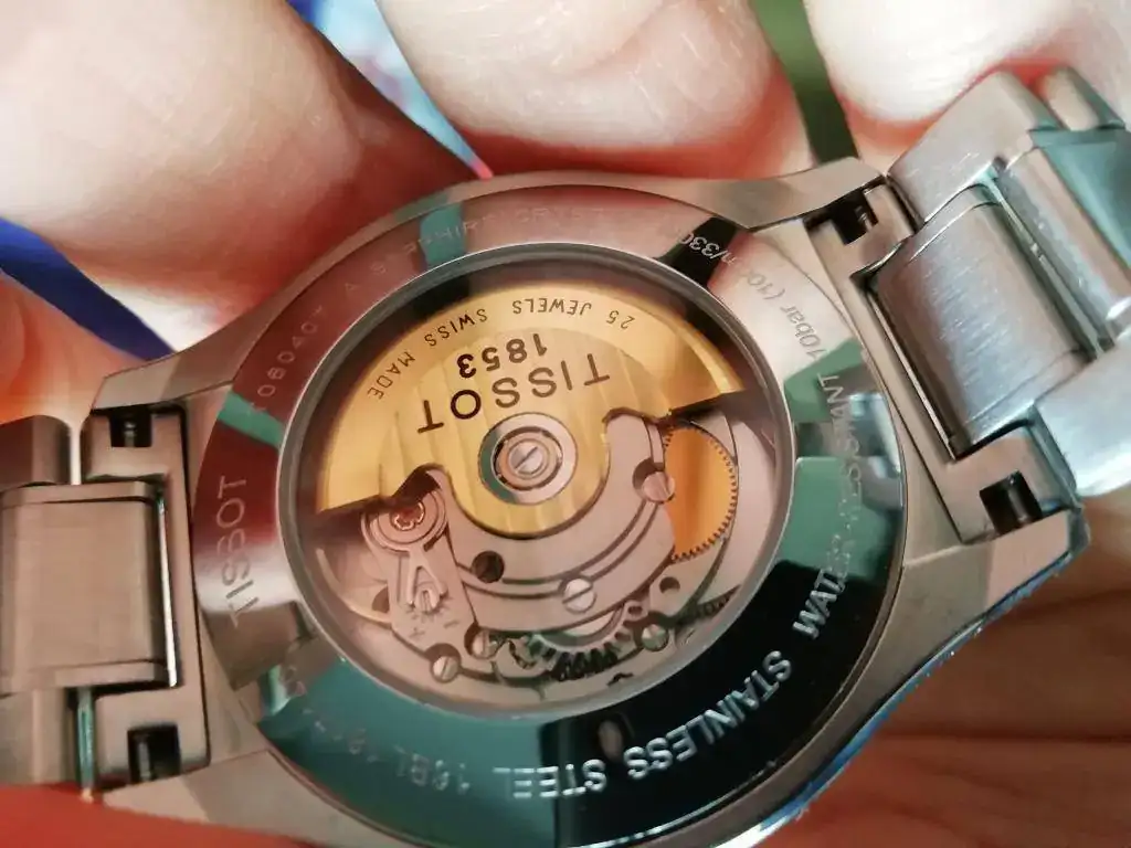 Monta un movimiento ETA 2824-2 y su resistencia al agua son 100 metros, la trasera es vista.