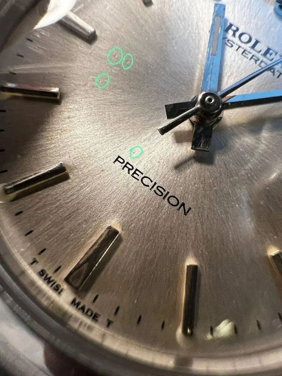 Buenas compañero, según me dijo en su día el relojero, se tuvo que reimprimir alguna inscripción porque estaba muy mal, y imagino que eso seria una de ellas, o eso quiero creer. Como ya veis soy bastante novato en todo esto y seguramente es facil que "me la cuelen" pero la esfera no se ve del todo perfecta si la miras de cerca. El relojero ha estado en rolex oficial 15 años y 2-3años en patek, y según me dijo era restaurada con reimpresión. Pero vuelvo a decir no lo se...Siento ser yo el portador de las malas noticias, pero ese dial (o esfera) no es el tuyo restaurado, sino uno nuevo.