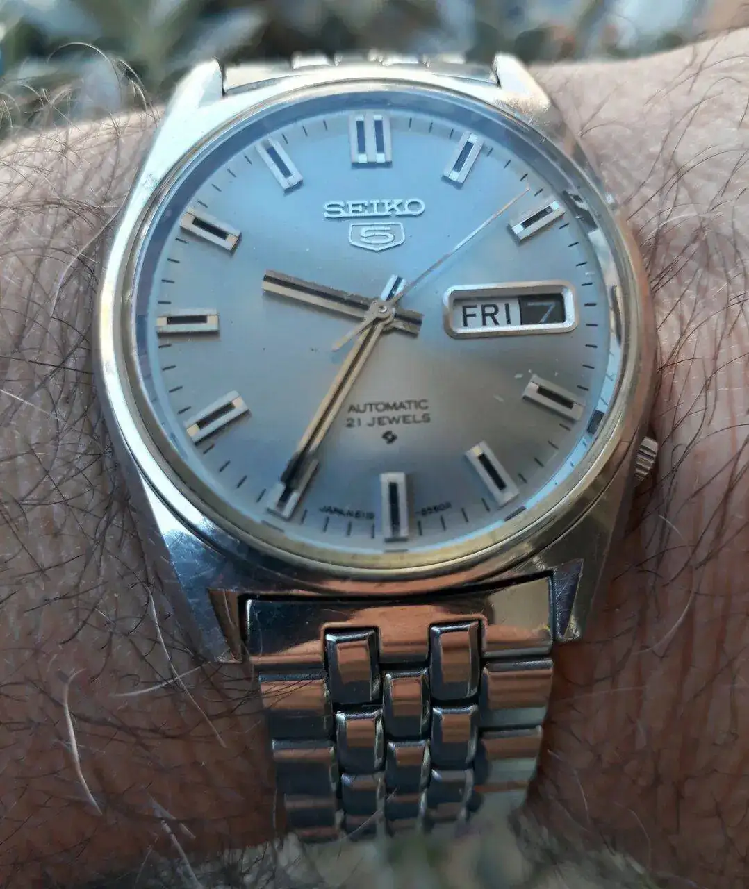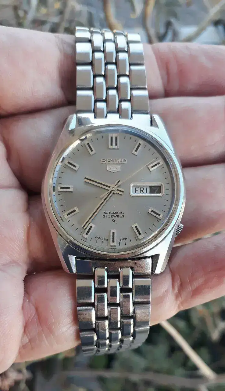 Feliz viernes para todos,hoy les comparto uno de mis consentidos de la colección,el Seiko 5 movimiento 6119-8095 waterproof de 1970,totalmente original,fechador a las 3 en ingles/números romanos para los días de la semana,21 joyas todo acero inoxidable,cristal plexi acrílico y brazalete tipo grano de arroz,restauración propia,funcionando perfectamente,este fue mi primer Seiko 5 de entrar a mi colección hace algunos años.
