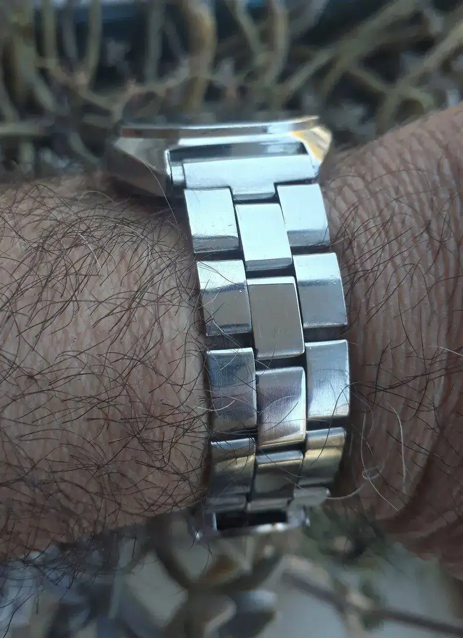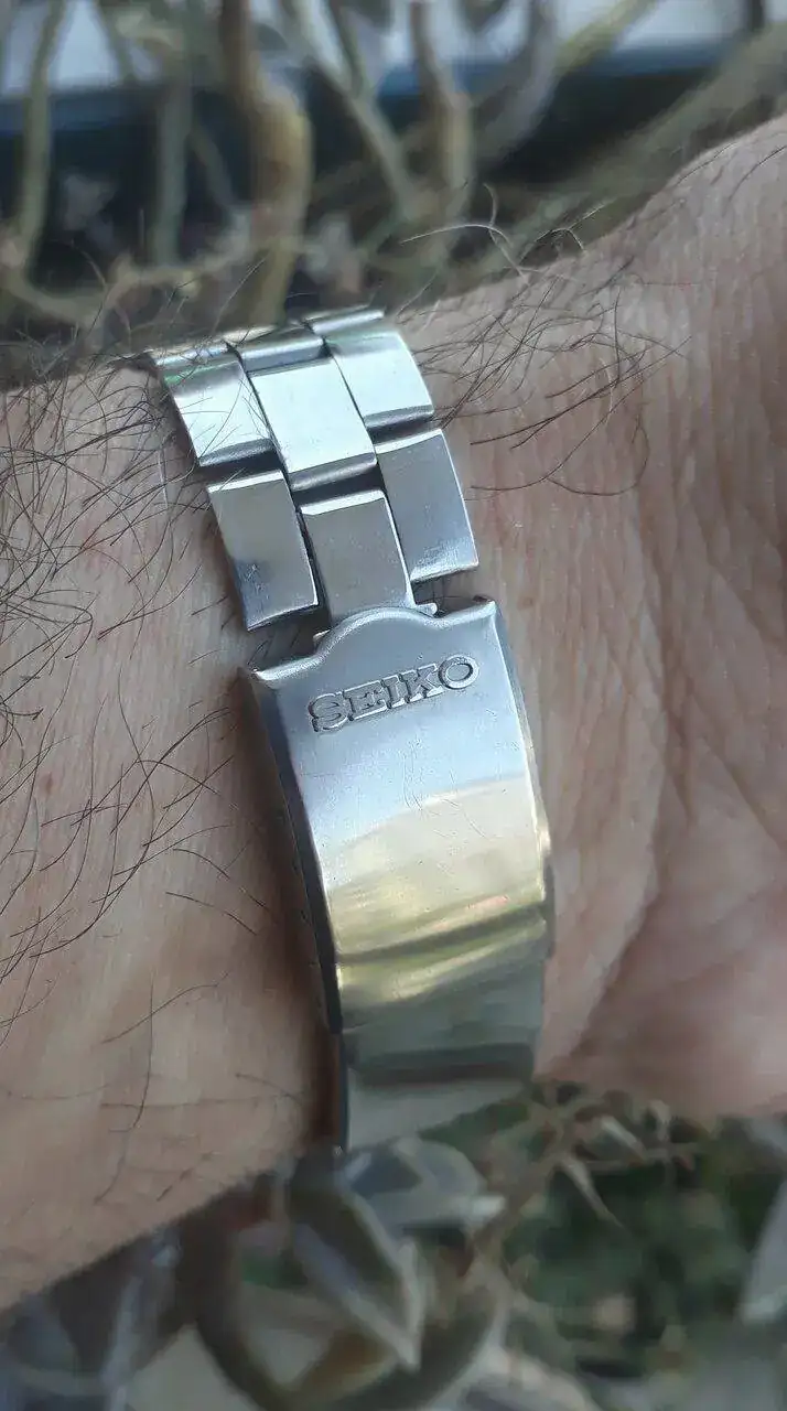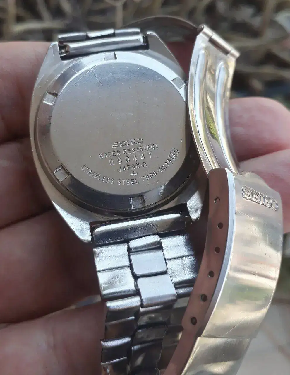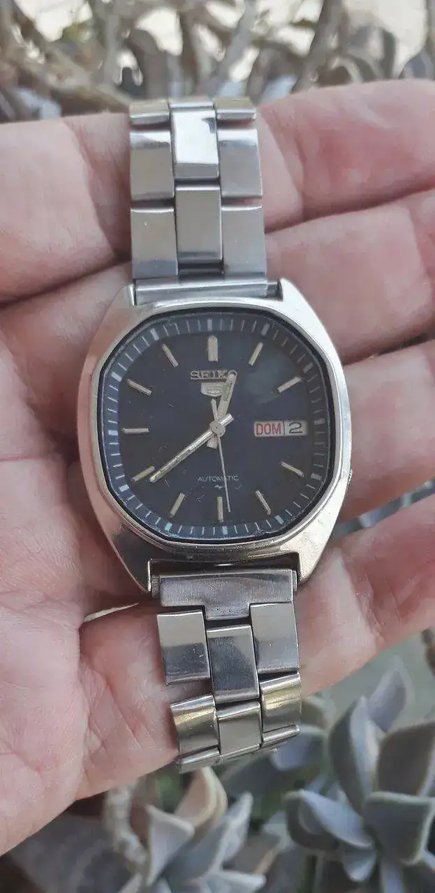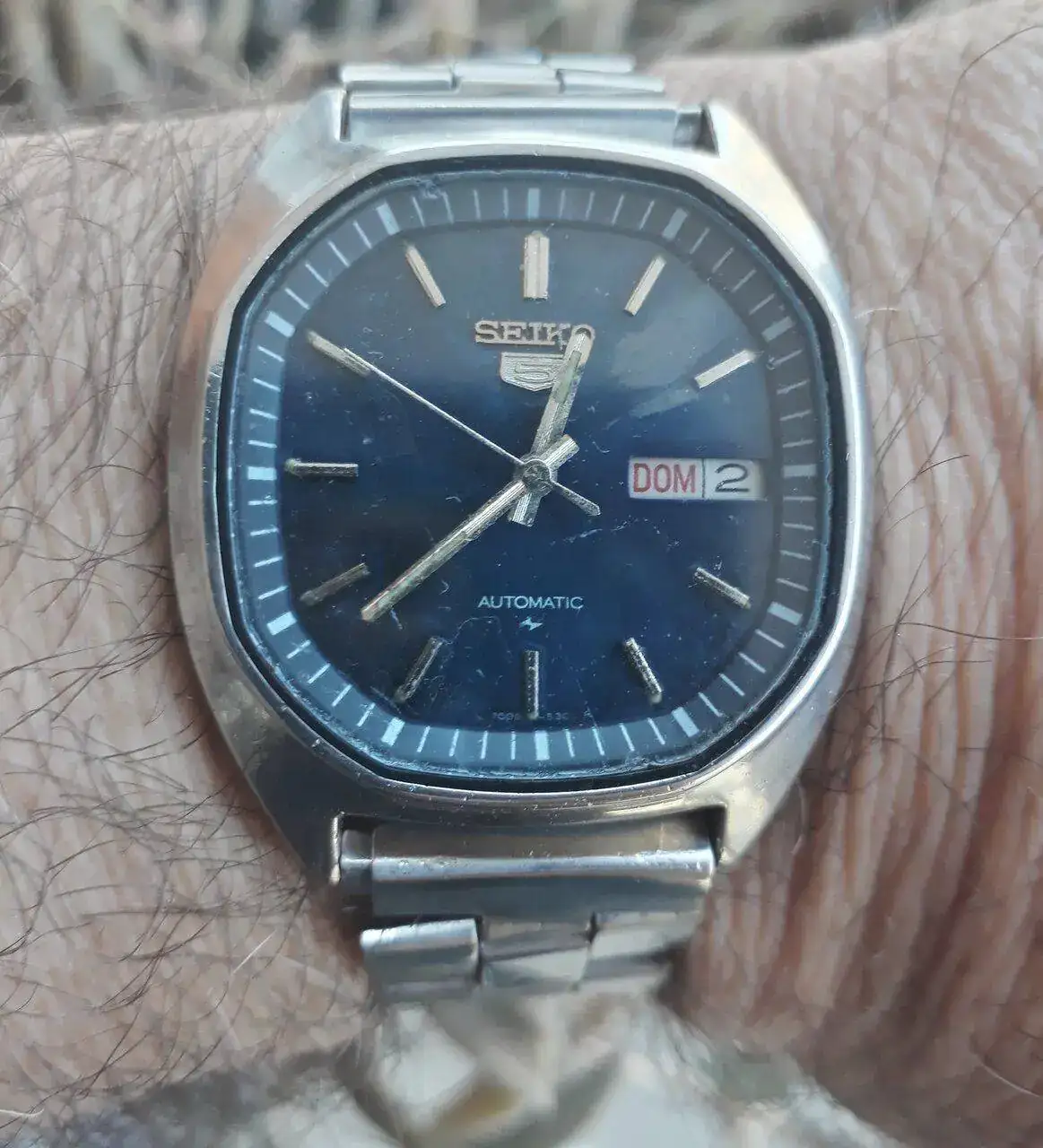 Hoy domingo con el Seiko 5 movimiento 7009-521A de 1980,cristal Harlex original con daños a la vista,una pieza muy desgastada,que compre sin funcionar,hoy esta restaurada con algunas cicatrices de su extensivo uso,funcionando perfectamente,es el Seiko de batalla al que siempre uso libremente sin preocuparme por causar