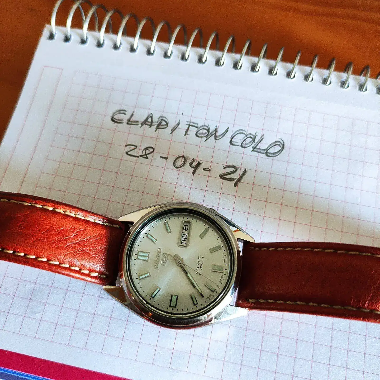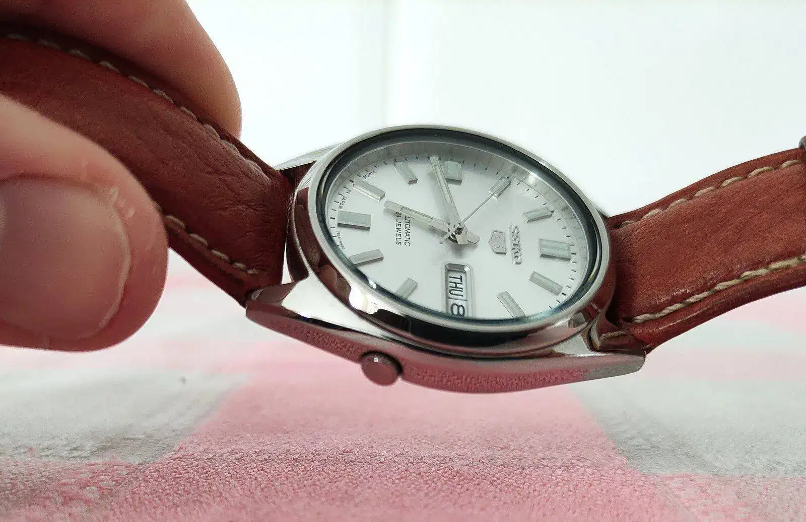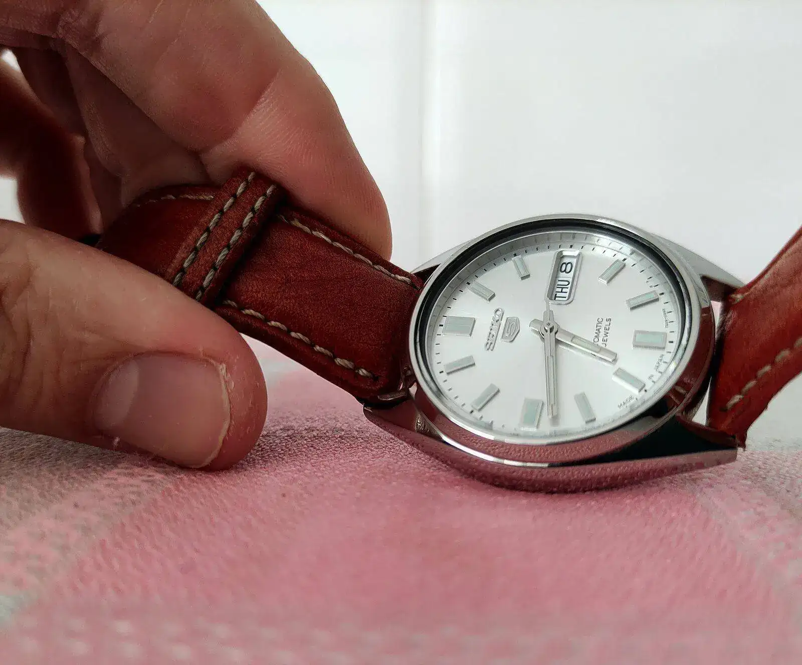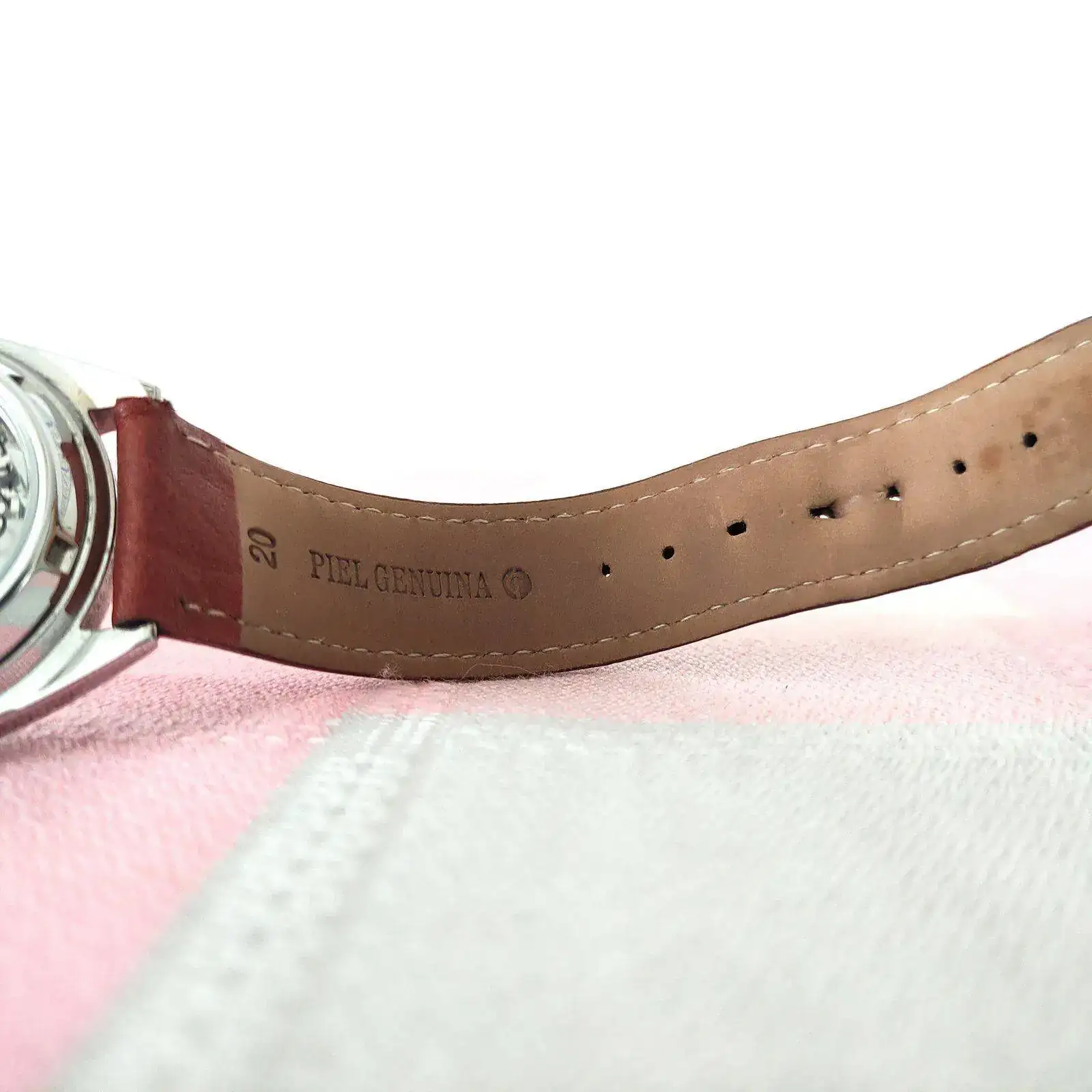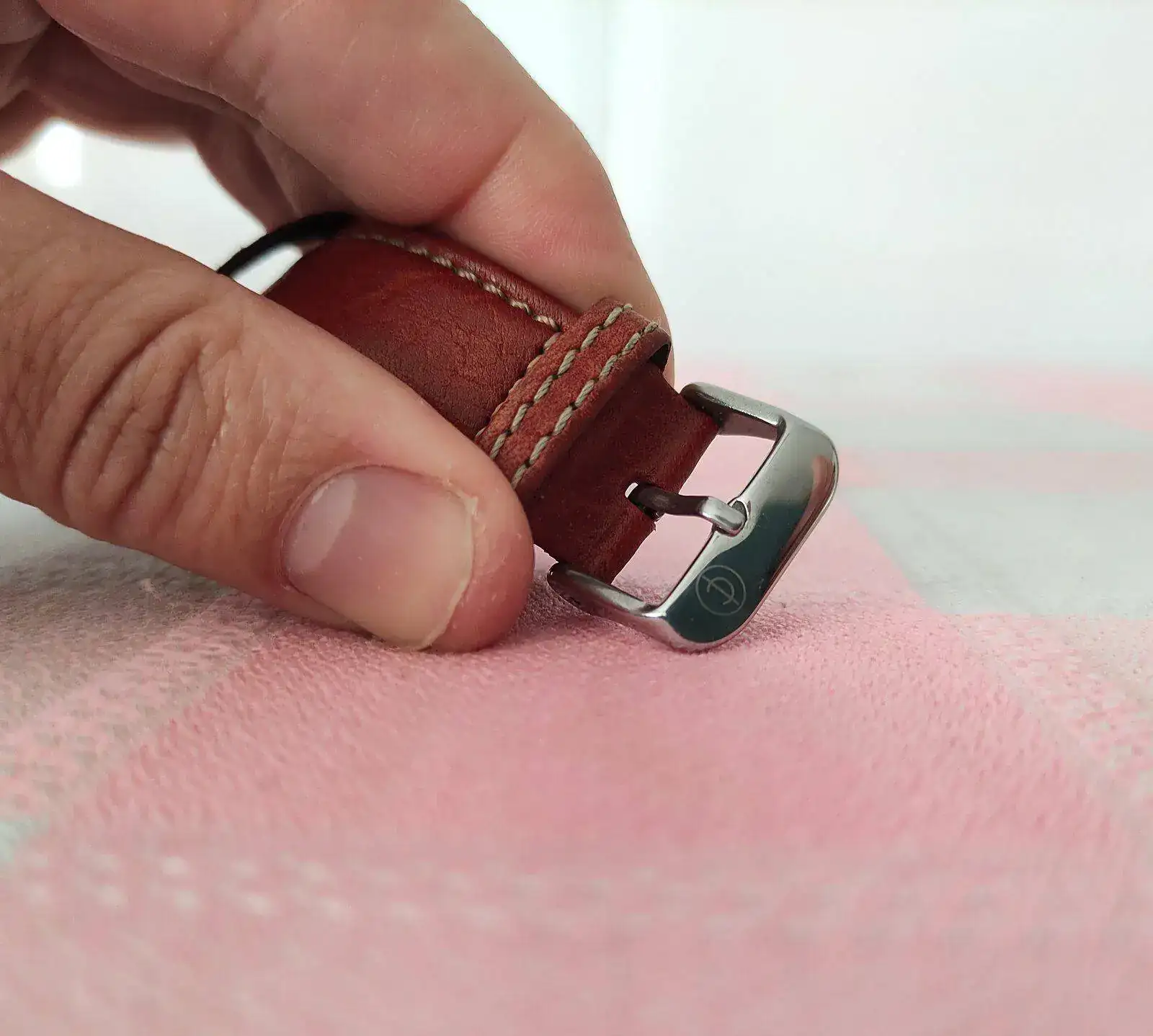 Bien ajustado, en perfecto estado y con una correa excelente de piel natural. No le veo marcas en ningun sitio, puede tener micropelos pero no los veo, apenas lo he usado.