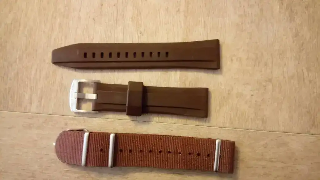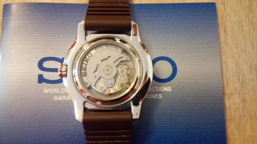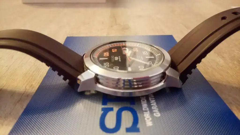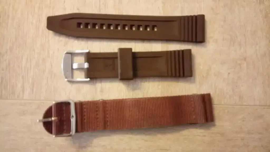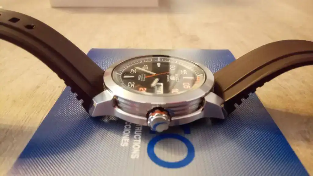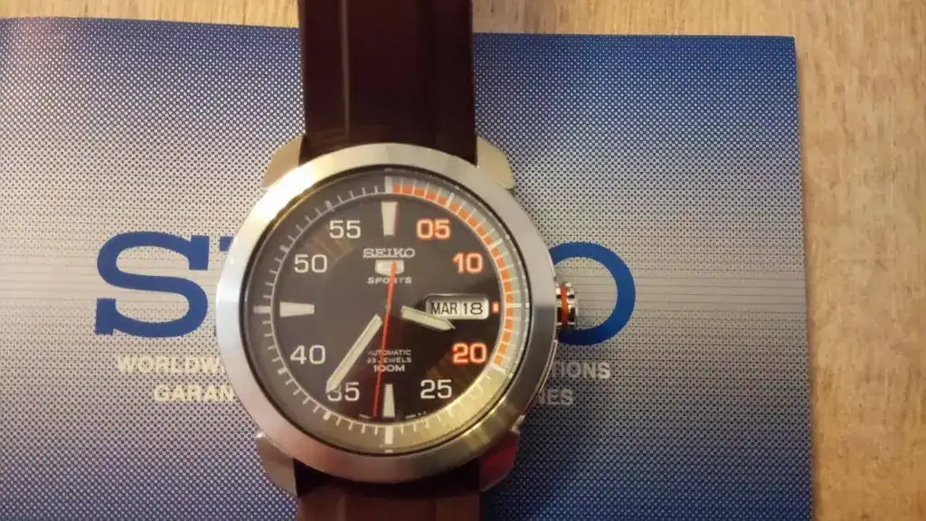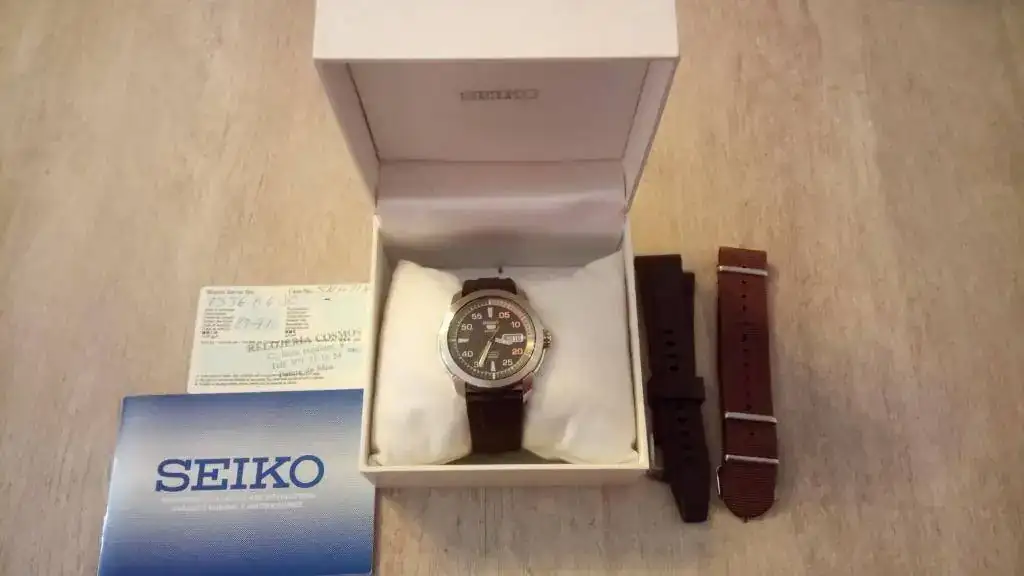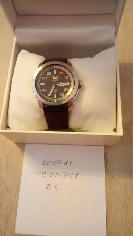 Seguimos con la "operación reducción". En este caso se trata de mi primer reloj automático, al que le tengo mucho aprecio y que no tenía intención de vender nunca, pero es que ya no lo uso y me da cosa verlo parado en la caja tanto tiempo. Es el conocido como Seiko 5 Piston (por las estrías de la caja, que parecen un pistón de motor) en su versión marrón/naranja, que creo que es la más bonita, con unas olas en el centro de la esfera, y ya descatalogado. El reloj es de 2010, y a pesar de haberlo usado con regularidad los primeros años, está impoluto al 99% (algún pelillo hay en la parte trasera de las asas, fruto de algún cambio de correa), y el cristal está perfecto. Adjunto una nato marrón del mismo tono y un caucho original adicional. Decir que el caucho que lleva montado (con un agujero adicional hecho por mí), a pesar de que es el suyo no es el que me vino con el reloj estrictamente, ya que al original "de verdad" se le rompió la trabilla al cabo de casi dos años, y en el SAT me lo cambiaron en garantía (aproveché para pedir otro de repuesto, que es el que adjunto). Así que, en cuanto a los cauchos, el que lleva es muy nuevo (porque desde entonces casi no lo he usado) y el otro nunca lo he puesto).