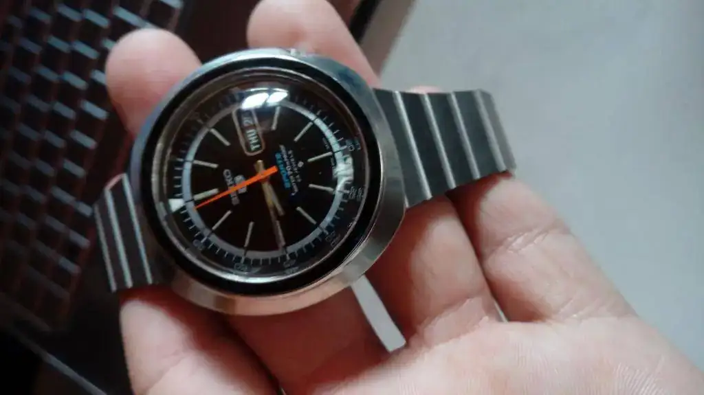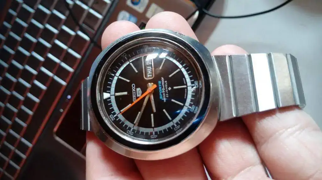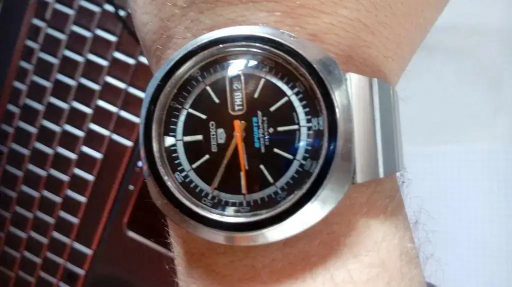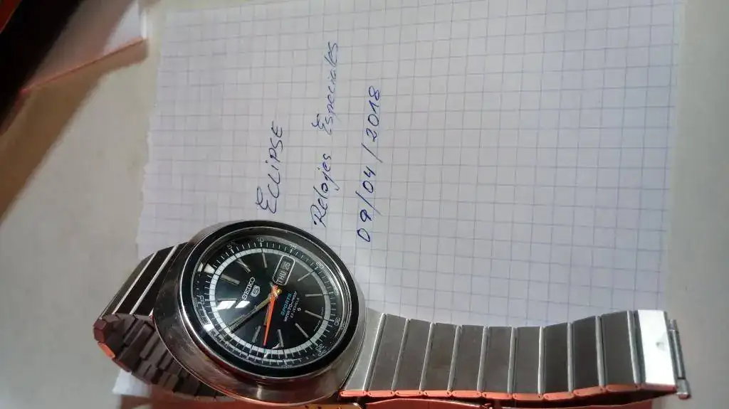 Pongo en venta este precioso modelo de Seiko de la década de los '70. Monta el calibre 6106 con pase rápido de fecha apretando la corona. El estado del reloj es bueno. La caja no presenta marcas reseñables y el cristal mineral tampoco. El dial es el original y ha envejecido muy bien. El contraste con el naranja de la segundera es precioso. No puedo hablar de la marcha porque me lo he puesto un día desde que me llegó