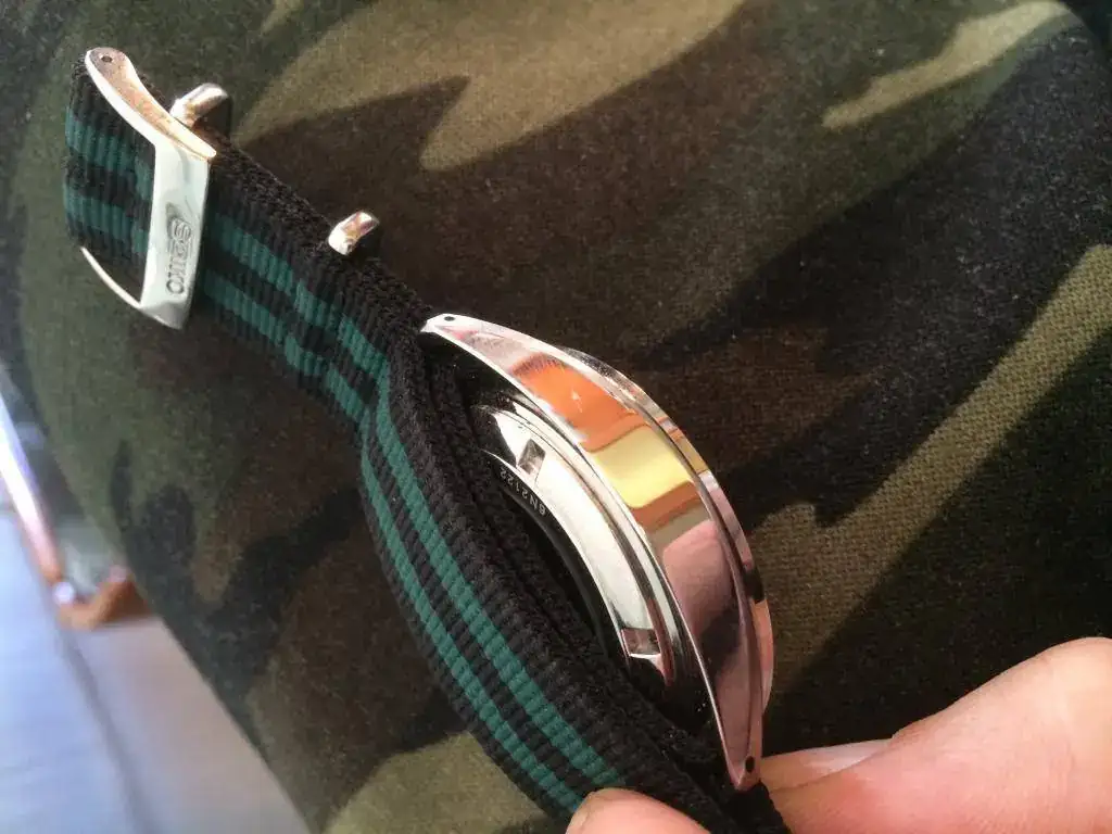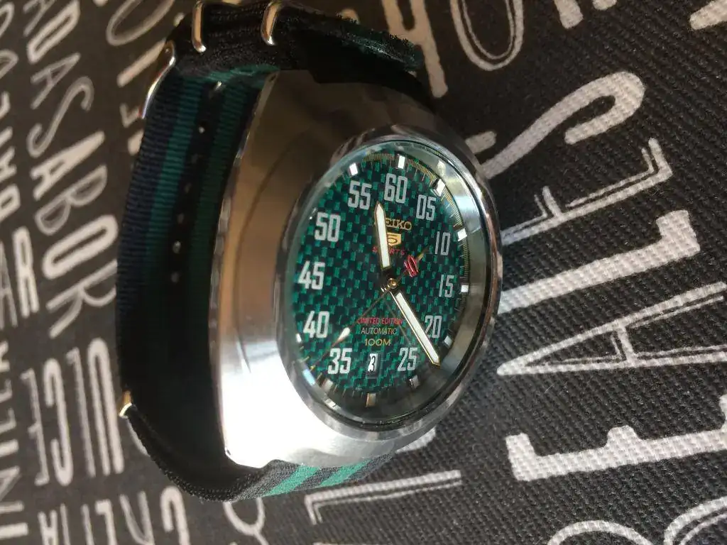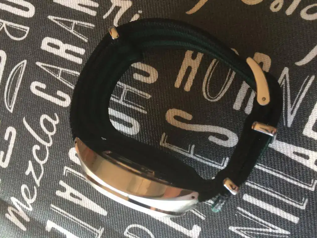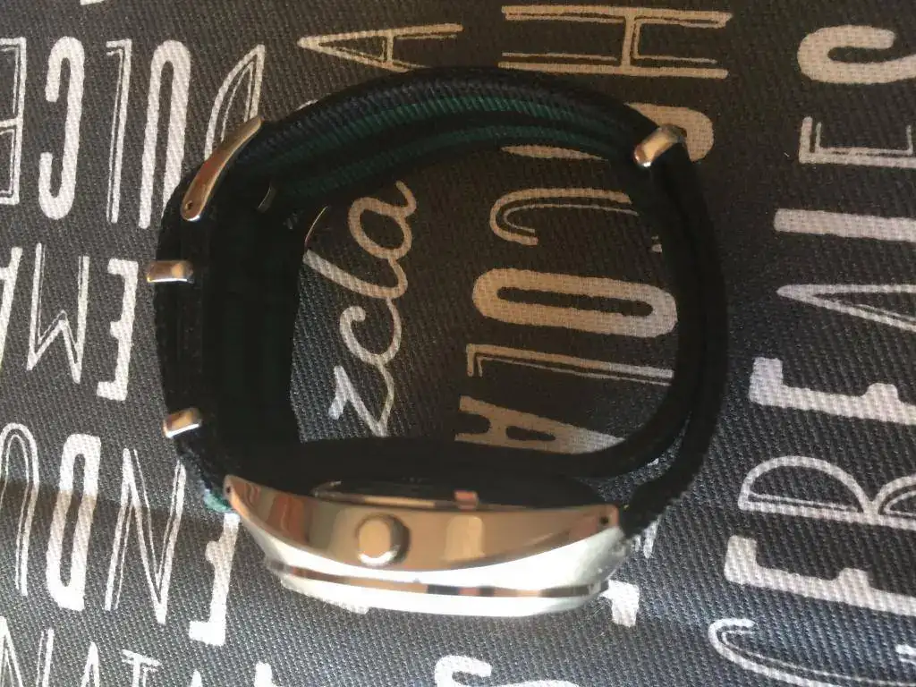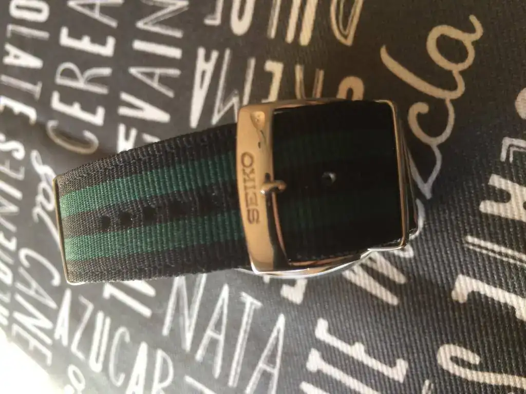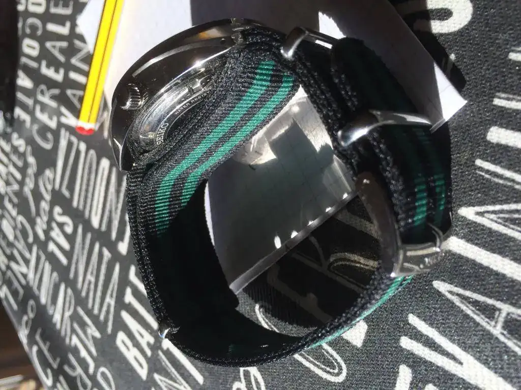 Viene con una nato verde y negra de calidad a juego y hebilla firmada.