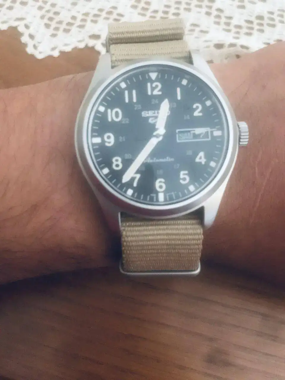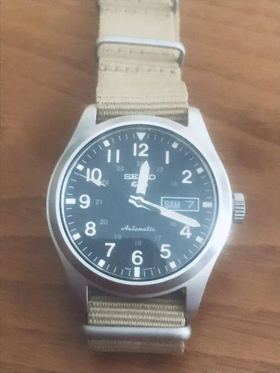 Me gustaria enseñar el reloj que llevo hoy puesto y que adquiri hace unos dias, es un Seiko 5 sports field military. Es un reloj funcional cómodo y bonito. Desconozco el material de la caja y la corona pero es muy suave al tacto. La esfera negra le da una belleza increible combinada con el color ocre del material luminescente de las agujas y los números, el cristal es mineral y antireflejos. Es un reloj automático, La maquinaria es visible tiene una inscripción en la masa que pone "twenty four jewels 4R 36A Seiko Time corp". En uno de los laterales se puede leer water resist 10 BAR La correa es de Nylon y tiene la inscripción de Seiko. Adelanta 3 minutos y medio a la semana, en mi opinión la verdad no es un desfase muy grande aunque se podria corregir. Por lo demás creo que es un reloj que por su precio tiene una gran calidad, lo disfruto mucho. Me en cantan los relojes militares de hecho le tengo hechado el