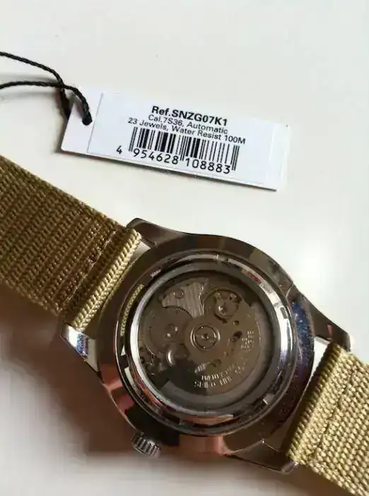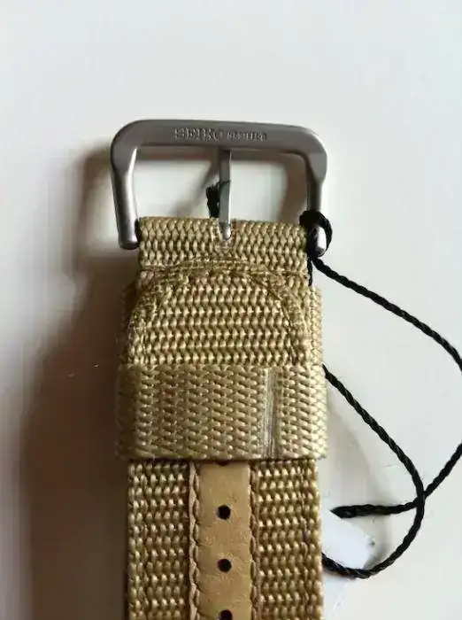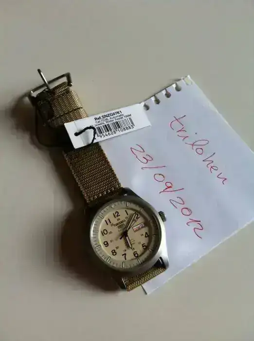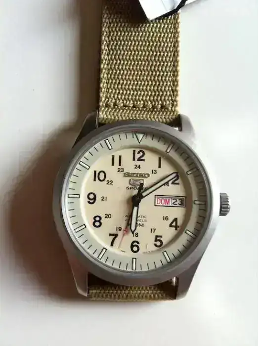 Vendo Seiko 5 Sports Military 42mm automatic nylon beige con número de catálogo SNZG07K1 de reestreno. No tengo caja, ni garantía, ni papeles porque, sinceramente, no recuerdo de dónde me llegó ni cuando. Creo que fue fruto de un cambio múltiple. El caso es que está impoluto y sin un solo uso más que el de haber pasado de mano de su anterior dueño a la mía. Funciona a la perfección. Las características son de sobras conocidas y el movimiento es el más que fiable de Seiko 7S36 de 23 rubíes, caja de acero inoxidable acabado arenado y correa de nylon extra resistente con la hebilla también en acero. El fondo es visto y tiene un WR de 100m.