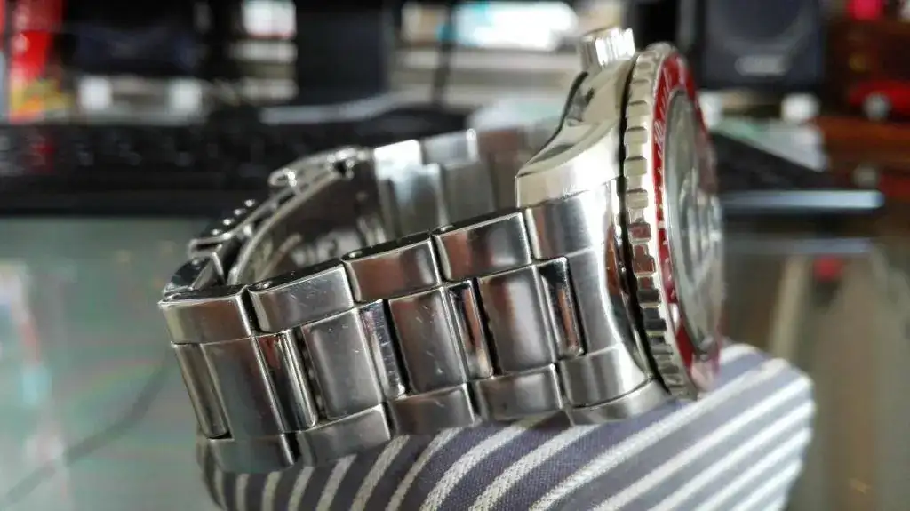 El cristal tiene una raya de 1cm. aprox entre las 10 y las 15, hay que buscarla en su angulo pero esta, en el bisel no hay nada excepto una pequeña hendidura, que apenas se ve esta al lado del 25. El resto de reloj son microrayas que apenas se ven.