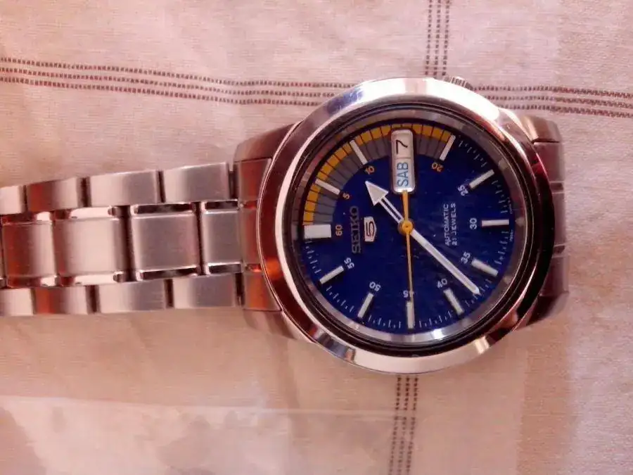 Vendo Seiko 5 azul con detalles en amarillo, de 38 mm. Comprado hace unos meses en concesionario oficial y aun en garantia. 60 euros envio incluido correos peninsular. Fotos: