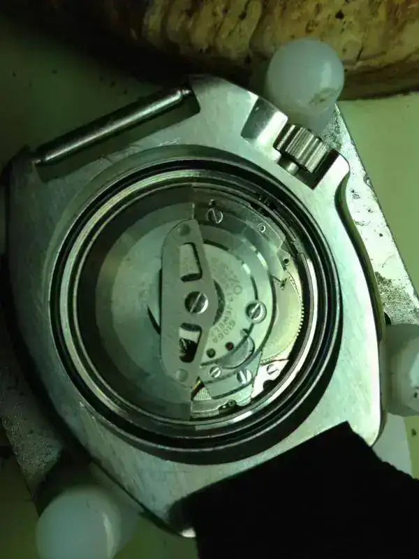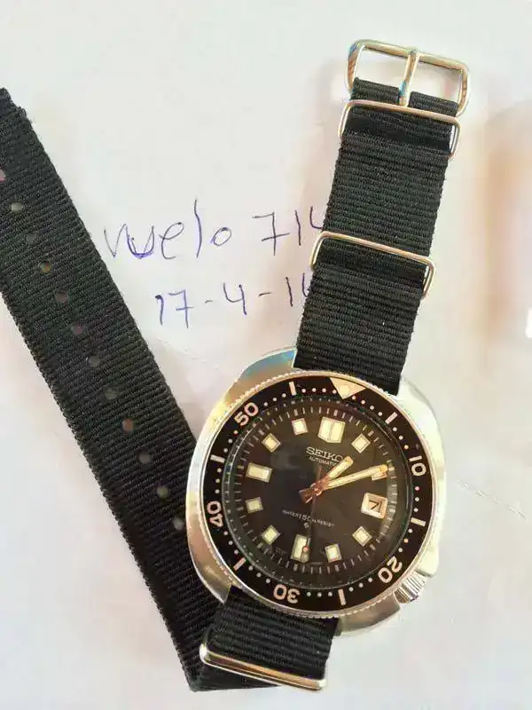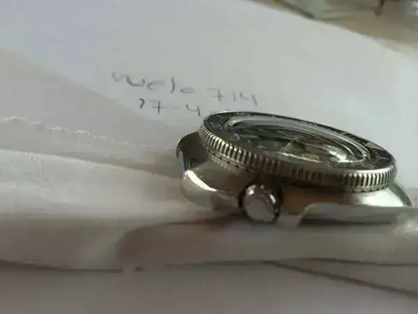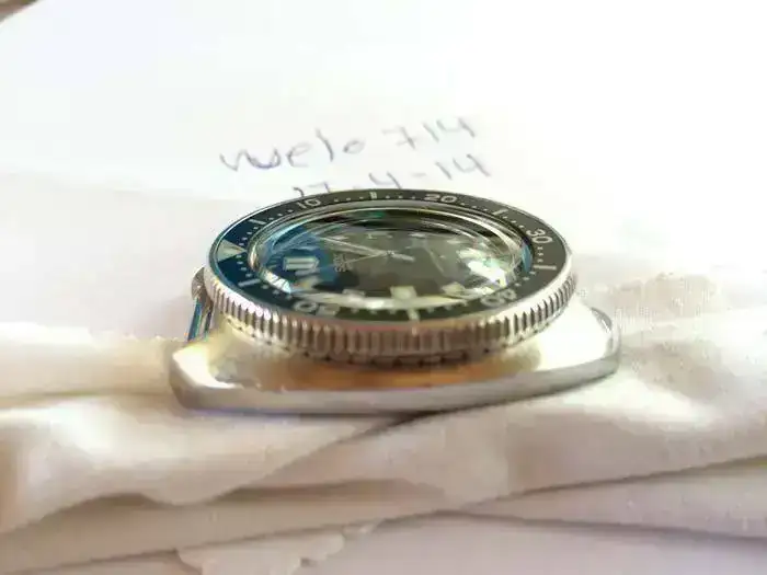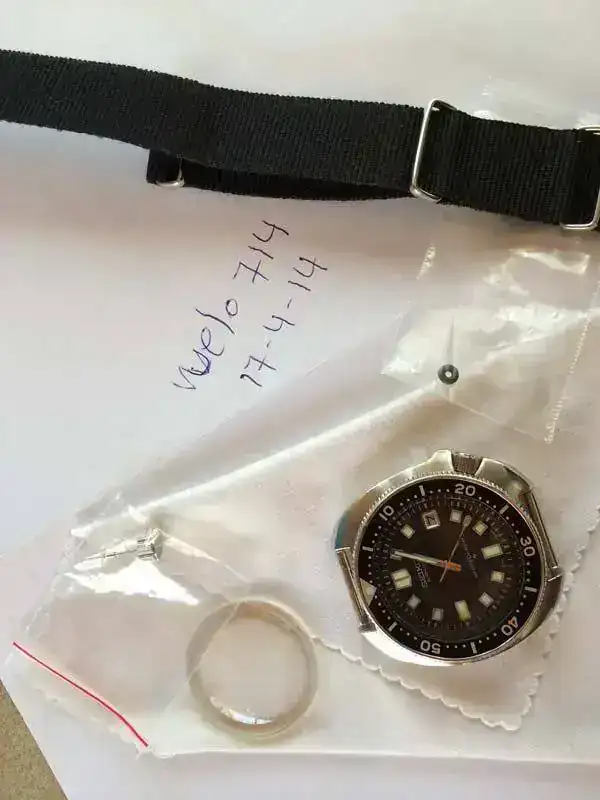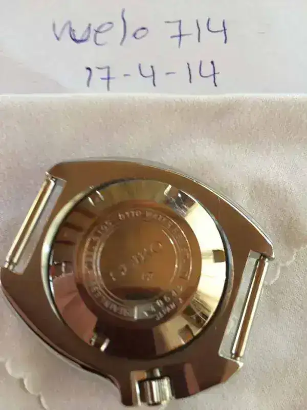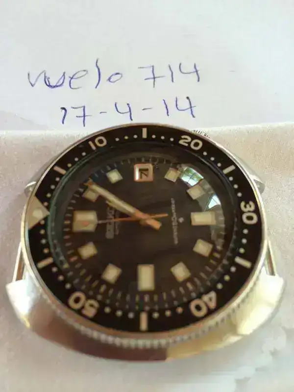 Se trata de un modelo del año 1971 mes de Abril, ya lo compre con el cristal Hardlex cambiado, tengo el original, yo mismo al llevarlo al SAT SEIKO de la Isla, Gestiser, hice una foto que pongo aquí, del movimiento, el cual va perfecto, “43 años que maravilla “, el tema es que cuando le pedí mirar la estanqueidad, me indico que necesitaba cambiar la junta de la corona, la encontré en UK, compre una corono con su junta, y otro junta para el futuro, ya que la junta de la caja es una junta habitual aun para SEIKO, lo cual quiero decir es que le pase la estanqueidad con la corona nueva puesta por el Gestiser, ahora bien ,nunca he probado el reloj en buceo ya que no es el que uso habitualmente y que lo vendo por esto mismo, por falta de uso.