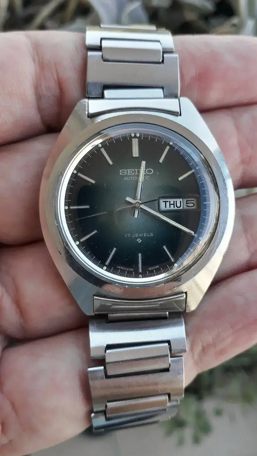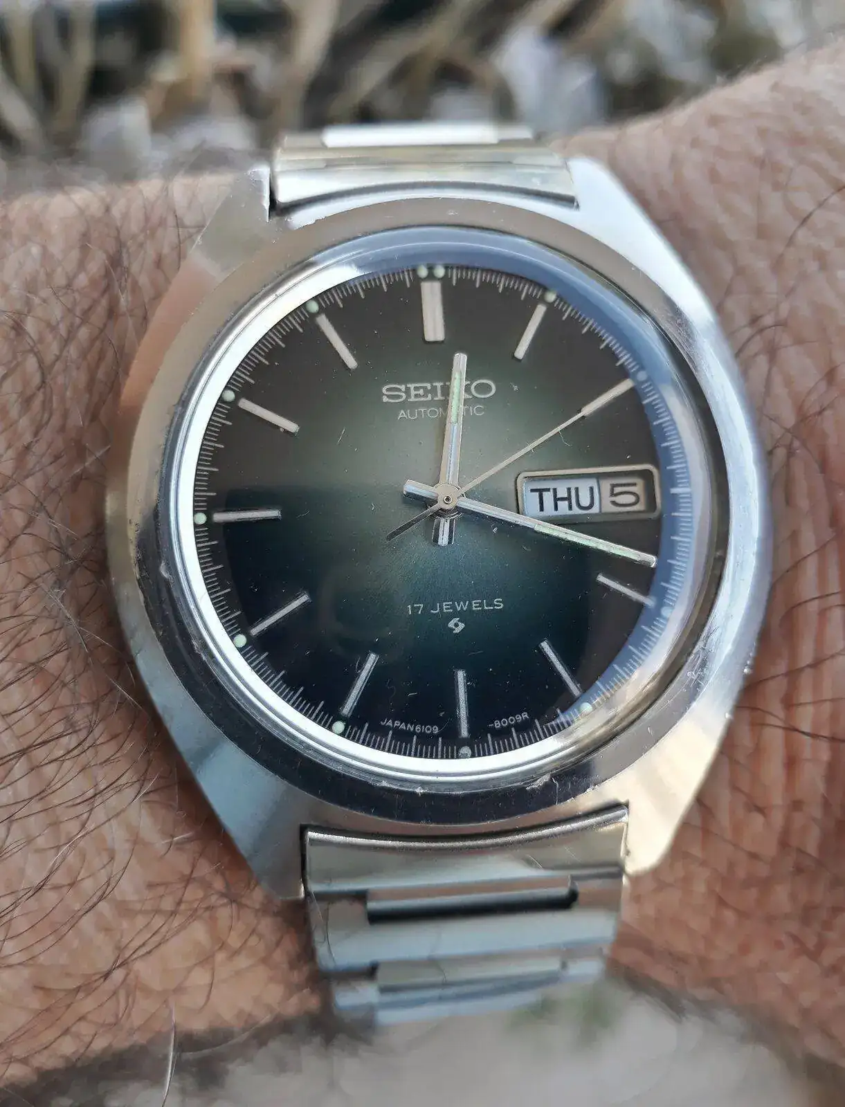 Hola amigos hoy les comparto mi Seiko 6109-8009P del '76 con su brazalete original,un raro modelo derivado del conocido Seiko 5 movimiento 6119,de este modelo solo se fabricaron con tres esferas o diales distintos,en verde como es en este caso,azul y blanco. Con muy pocos ejemplares se calcula que comenzó su producción en la década de 1970. Como siempre,funcionando perfectamente y restauración propia