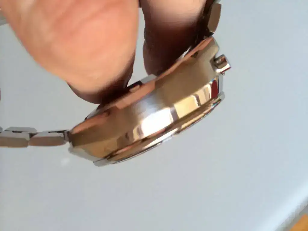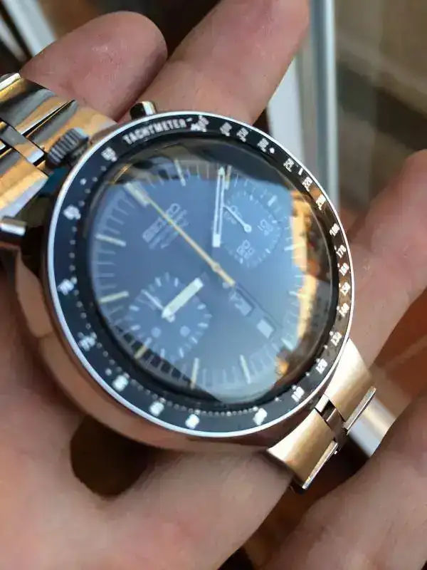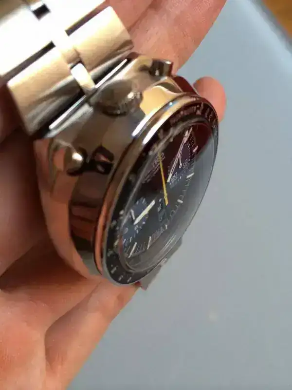 Solo tiene 2 pequeños detalles negativos uno el bisel taquimetro original con un ligero descascarillado en la marca de 500km/h. Minimo. Y la perdida del lumen en la aguja minutera que se quito en la revision y que no se ha repuesto. Siempre lo puede poner un relojero pero se ha preferido dejarlo asi.