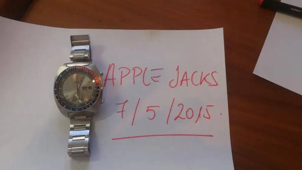 El orden de marcha es francamente bueno, con muy poca variación. No la he medido pero es mejor que la de movimientos eta que he tenido. Y ello a pesar de tener más de 40 años. Concretamente el año de fabricación es 1972 (utilizando la tabla de Excel que circula por ahí). El bisel interno gira perfectamente y el crono resetea a cero sin problemas.