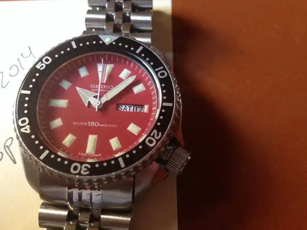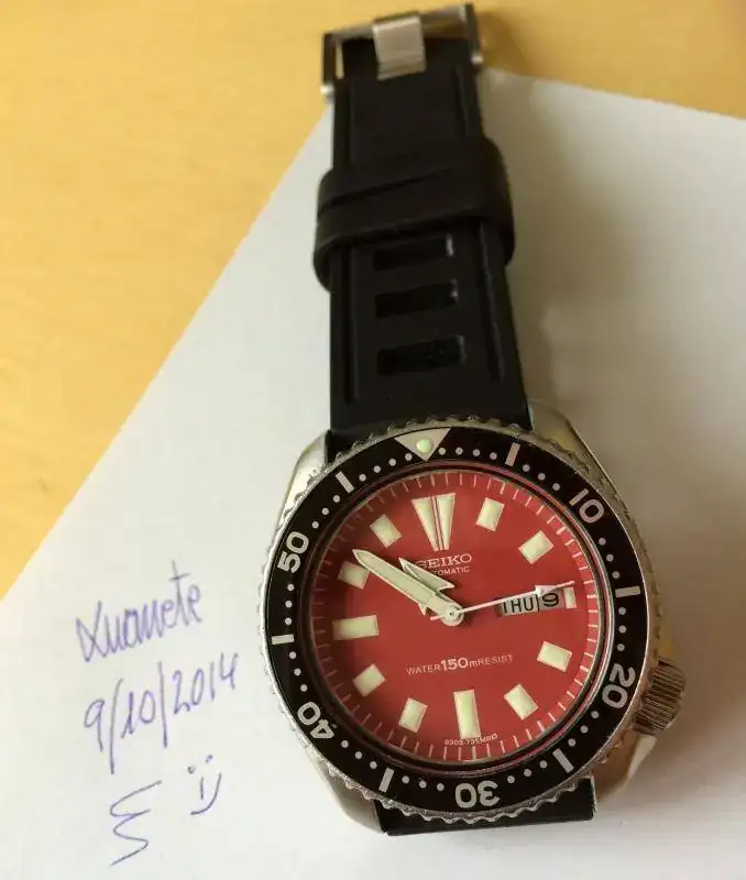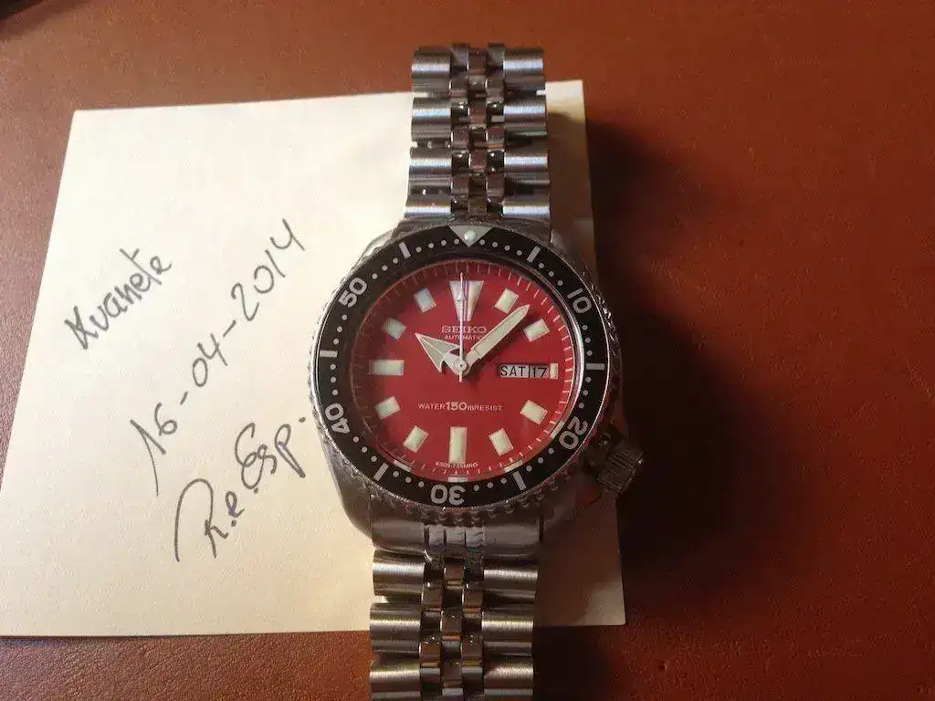 La caja se ha cepillado y pulido, con invitables marcas pero en muy buen estao. Máquina revisada, aceitada y ajustada por relojero, con todas sus juntas pero sin prueba de estanqueidad. Relumeado con luminova de alta calidad verde realmente espectacular y duradera. Dial, agujas, cristal e insert nuevos aftermarket.