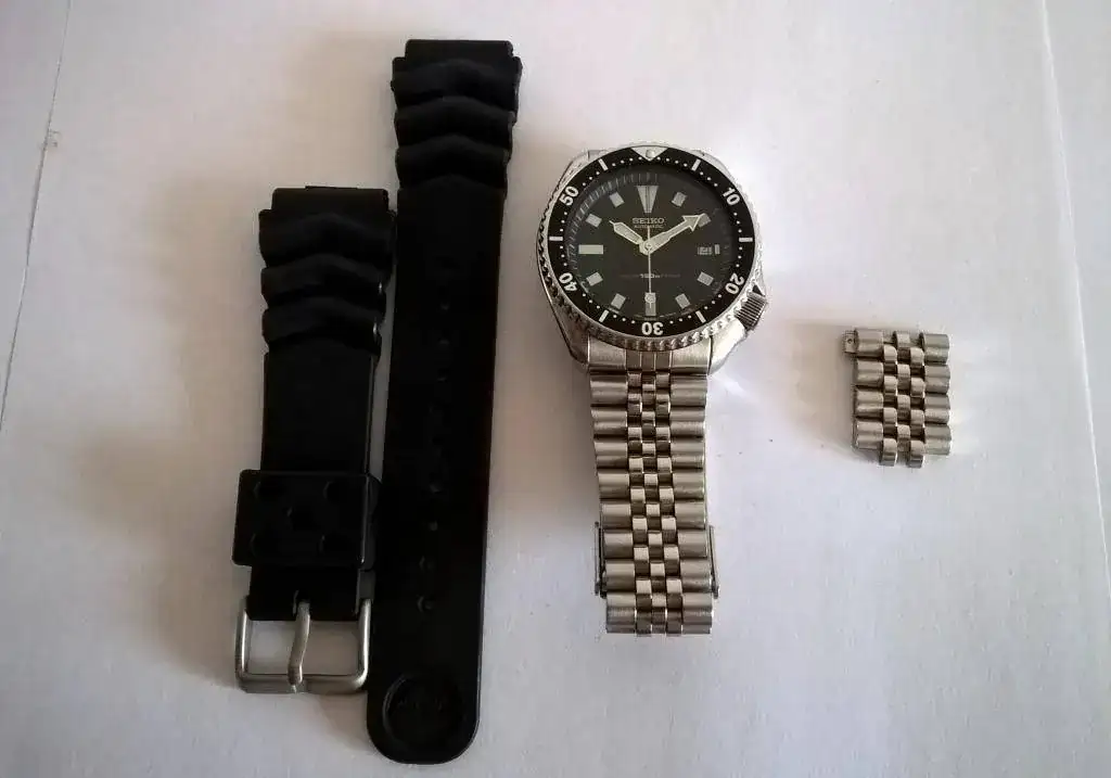 El reloj se entrega con un armis de acero (con marcas de uso en el cierre) y también una correa de caucho Z22 que también es aftermarket y aunque no está usada, el material empieza a estar pasado. El armis tiene una longitud de unos 17cms, y lleva unos 2 cms de eslabones adicionales. El cierre incluye microajuste.