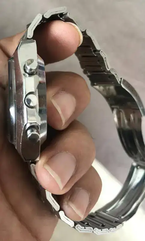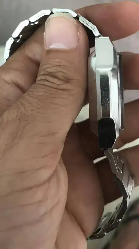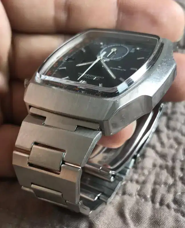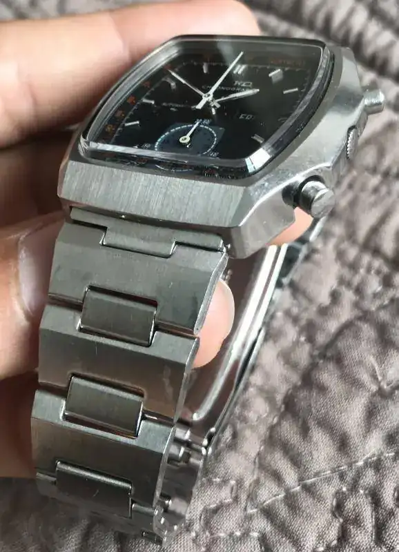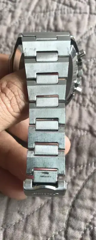 Este dato junto a las medidas contenidas del mismo ( 39 mm de ancho sin contar botones, y 42mm de alto ) lo hacen particularmente cómodo de llevar. Tiene su brazalete original, que viene con eslabones suficientes como para una muñeca de 18 cm de contorno y que es extremadamente ligero favoreciendo la comodidad anteriormente citada.