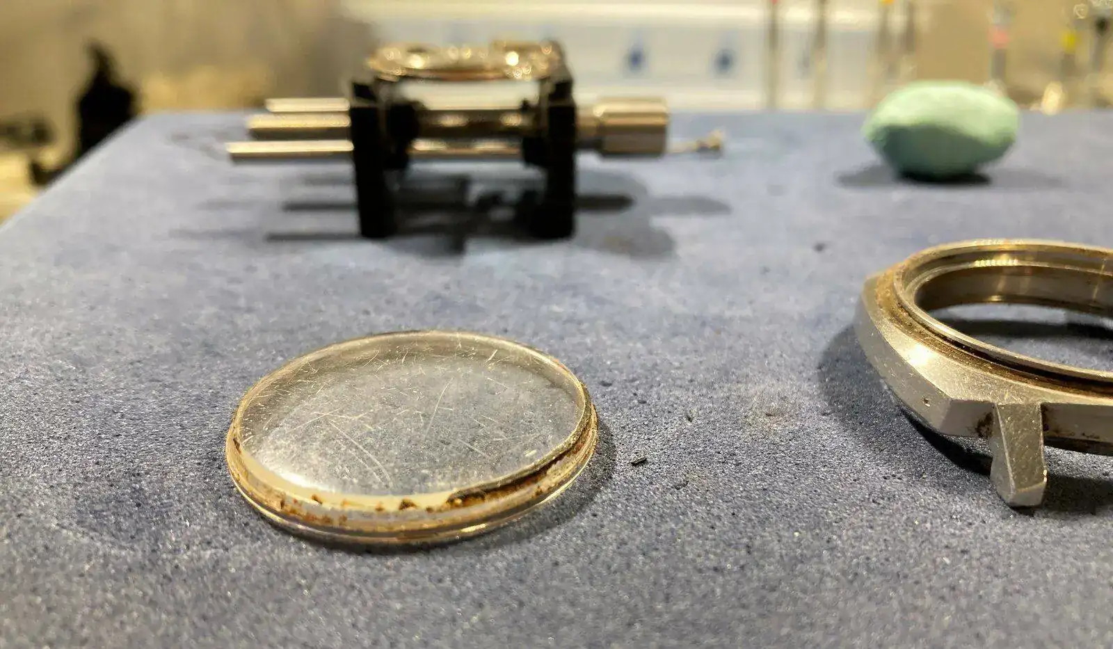 Montaje del disco de calendario y eliminación del oxido del envés del dial con lápiz de fibra de vidrio.
