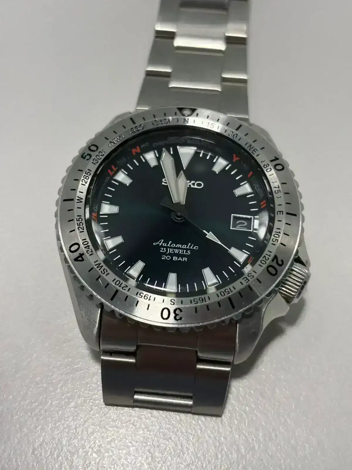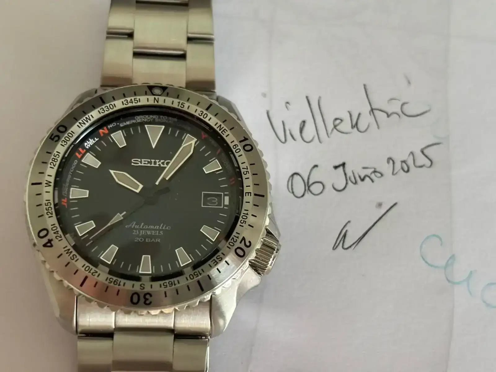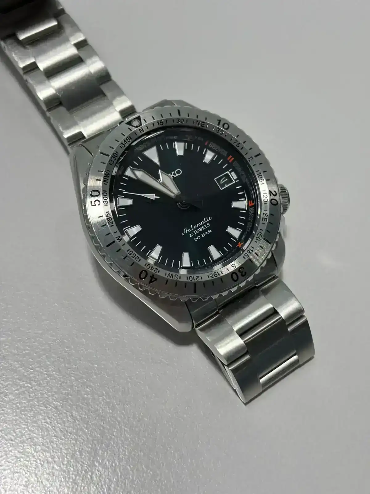 Saco a la venta esta pieza, un seiko alpinist SARB059, un reloj difícil de encontrar hoy en día, y más aun en buen estado. La distancia entre asas de tan solo 46mm para su diametro hace que pueda ser llevable en muñecas que habitualmente no aceptan relojes de 42mm. La esfera parece negra pero al sol tiene un verde oscuro muy bonito. El cepillado del bisel le da un aspecto muy especial.