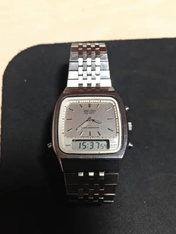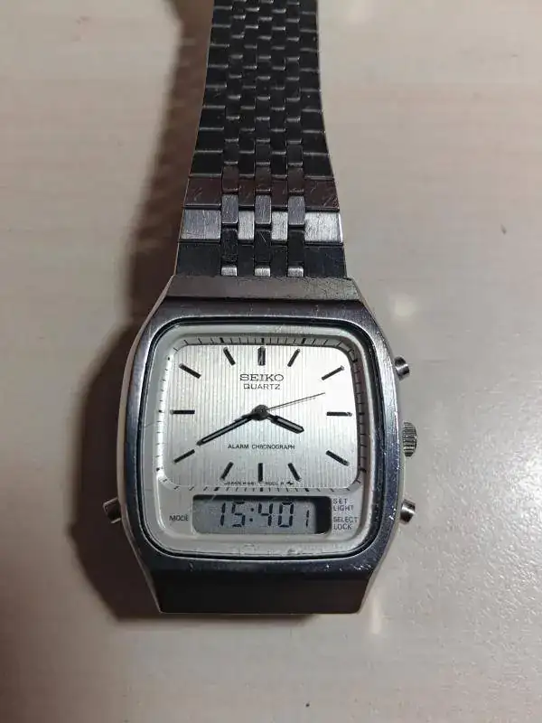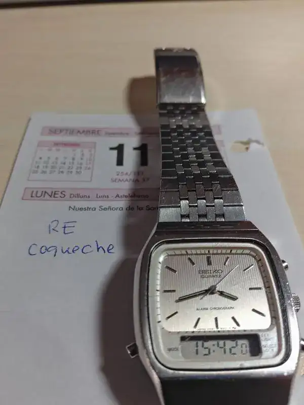 Hola muy buenas, sigo haciendo hueco en mi caja, y ahora le toca salir a este ana digi de Seiko, de los años 80. Es un reloj que compré en febrero de este año a su propietario de toda la vida, y que presenta heridas de guerra, tanto en cristal como en caja y armis, no obstante para los años que tiene sigue siendo ponible y funciona a la perfección, tanto el analógico como el digital. El motivo de la venta es que lo veo pequeño para mi muñeca. Mide 35x38 aproximadamente.