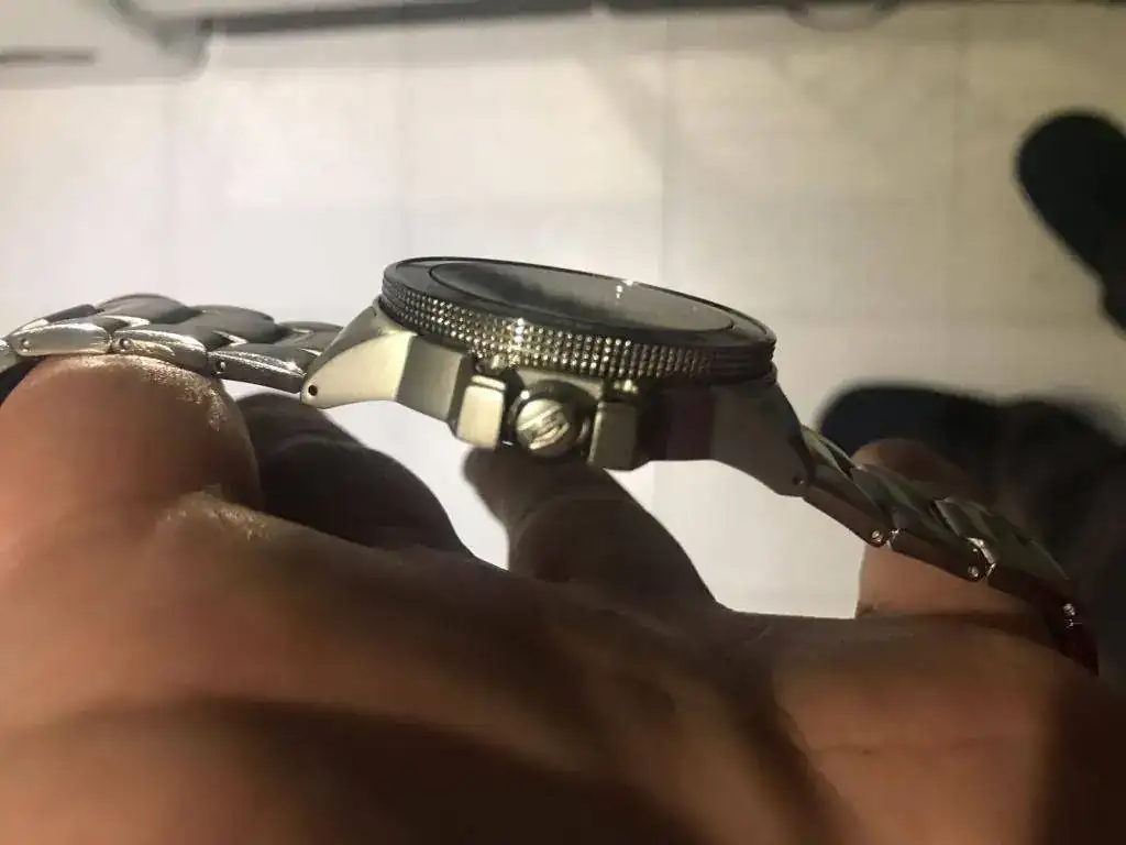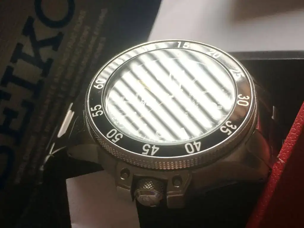 Es un reloj que viene con armis completo, en muy buen estado, no le veo marca en el bisel, y el cristal tiene un pequeño hilo, que no se si es fruto del antireflejo (en princpio no lo tiene) o unmarquita, que al pasar la uña o el dedo no se nota marca, por lo que es algo raro. Es poco apreciable (repito que es como si se marcara una pelusa en el antireflejo)