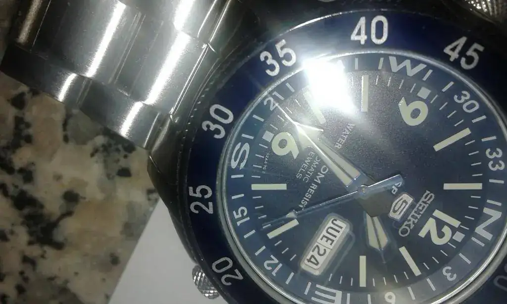 A la altura entre las 5 y las 6 en el cristal acabo de descubrir por las fotos un ligero rasguño que a simple vista no se nota a menos que le pongas especial empeño y a contraluz para verlo. Pongo foto (la segunda) para que se vea bien de lo que hablo.
