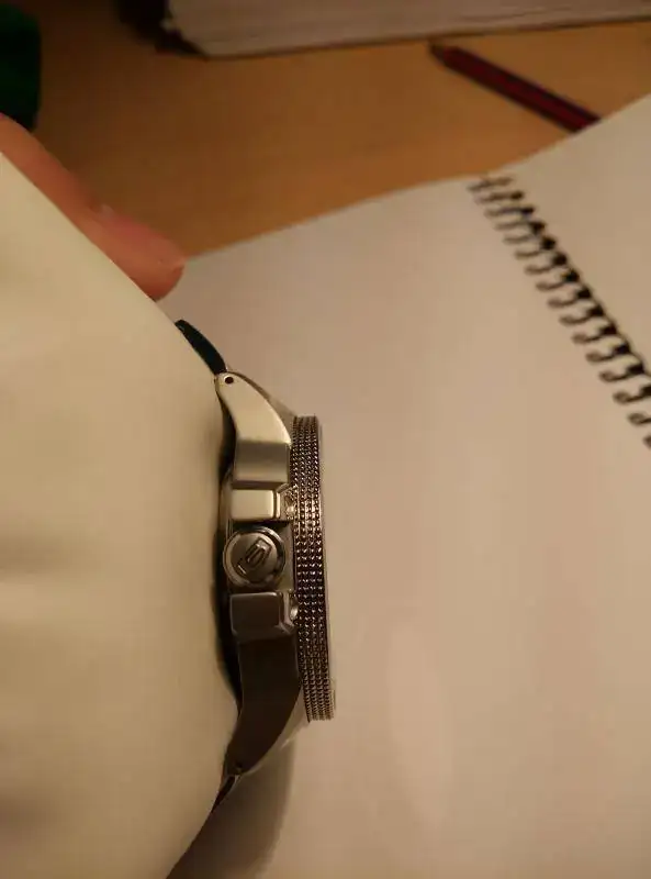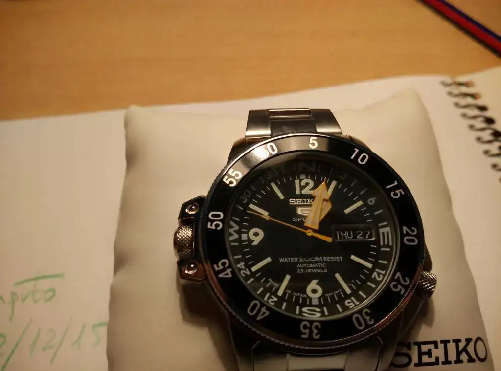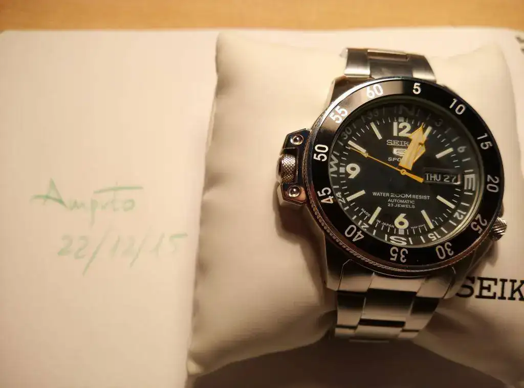 Reloj prácticamente nuevo. Es el modelo avispa: dial negro con agujas amarillas. Para mí, el más bonito de largo.No tiene más de... digamos 5 puestas, para no mentir (pero me lo habré puesto menos veces aún). Está totalmente libre de marcas en el cristal, bisel, caja, armis... Ahora que lo estoy mirando detenidamente, veo unas mínimas marcas en el cierre del armis (mínimos pelillos). Pero vamos, que hay que fijarse. Adjunto los eslabones sobrantes y una NATO negra con una estrecha franja verde que le queda genial (de las buenas, no de las de chapitas). No me termina de convencer este reloj, pero tengo que reconocer que es precioso.