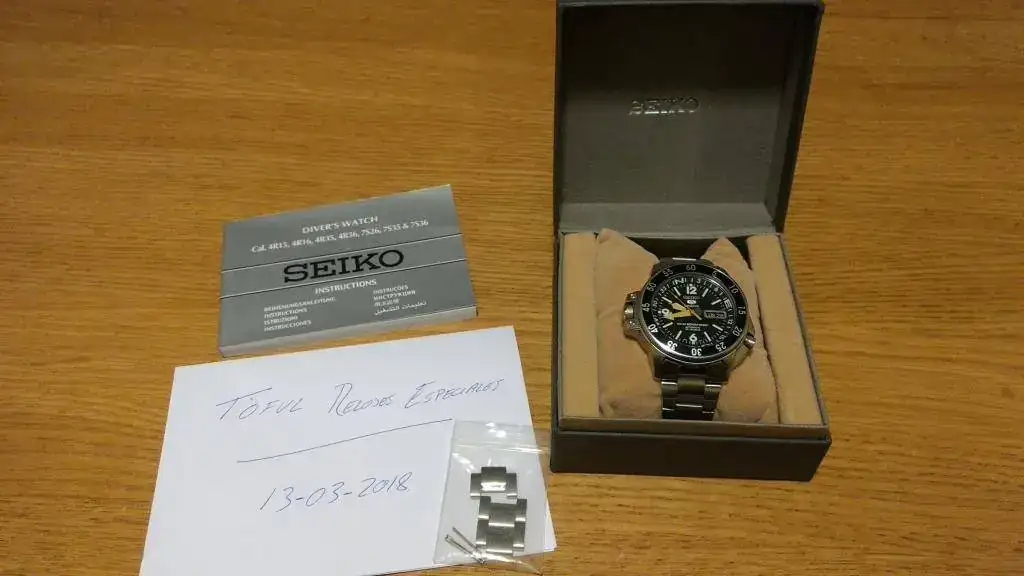 Se entrega con caja de cartón Seiko, manual y eslabones, está ajustado para muñeca de 17, pero entrego también los eslabones sobrantes. El precio 139€ con envío incluido, en esta ocasión no quiero cambios porque la venta financiará parte de una nueva compra ya cerrada.