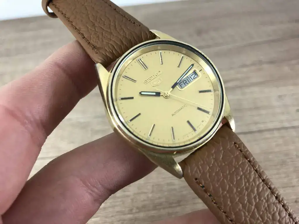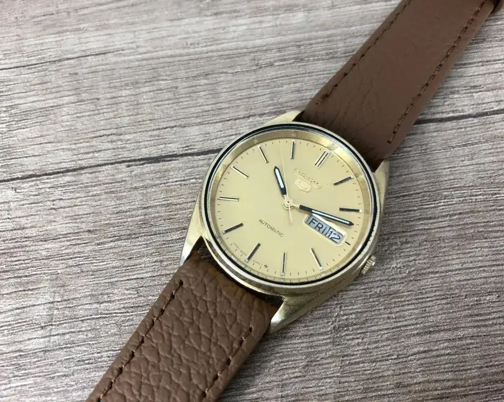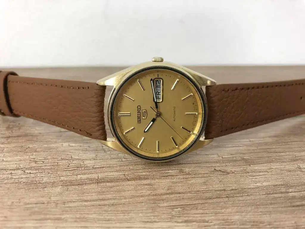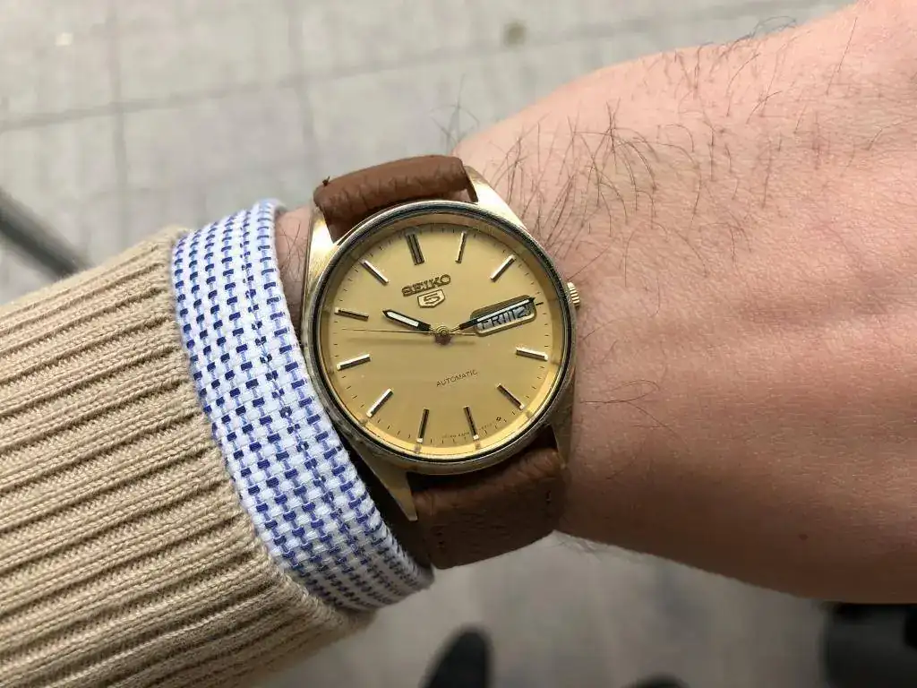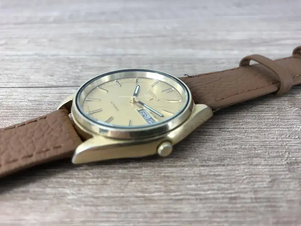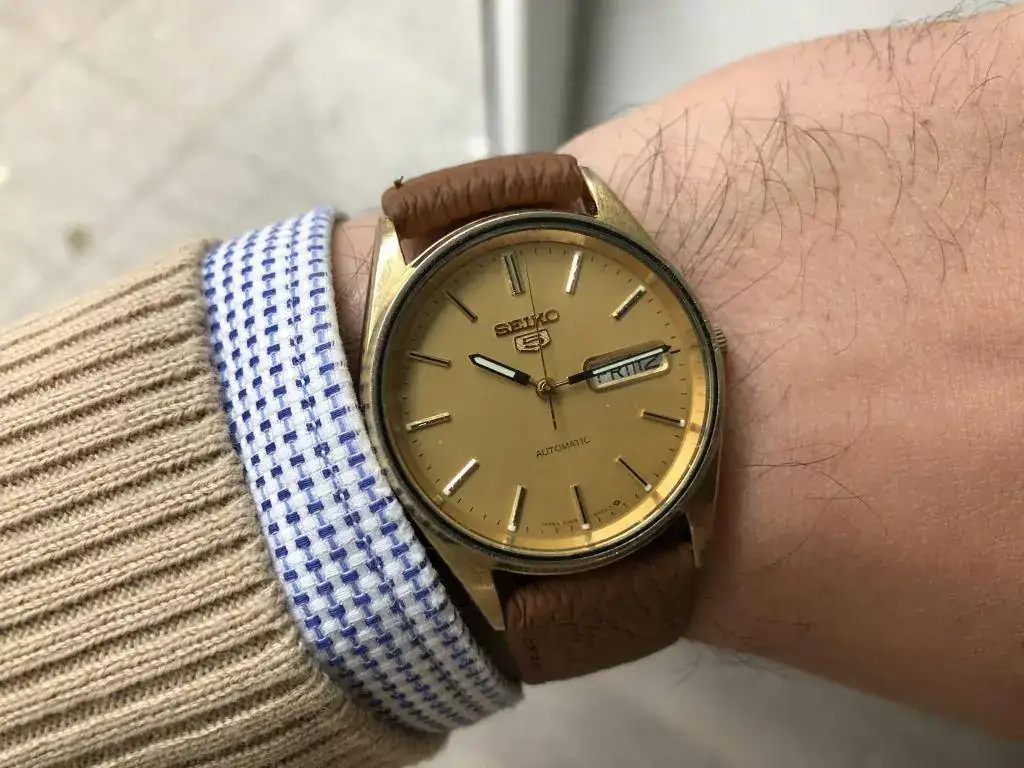 Buenas, saco para la venta este bonito Seiko 5 automático. Setentero y con baño dorado que esta en perfecto estado, no ha perdido ni nada. El reloj en conclusiones generales esta en bastante buen estado, cristal mineral y correa de piel nueva a estrenar. Esta recién revisado ya que hace tiempo que no lo uso y lo mande a revisar, por lo que tiene la garantía de 1 año de la revisión.