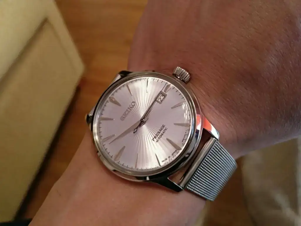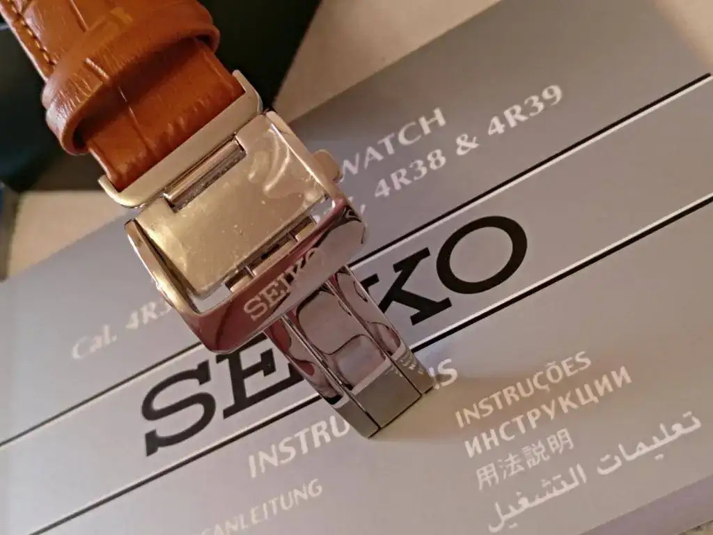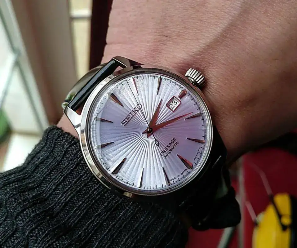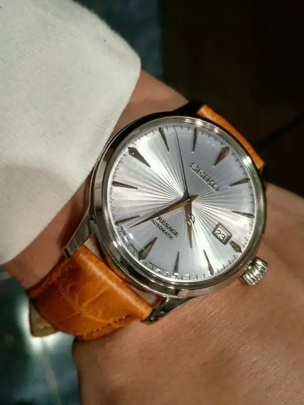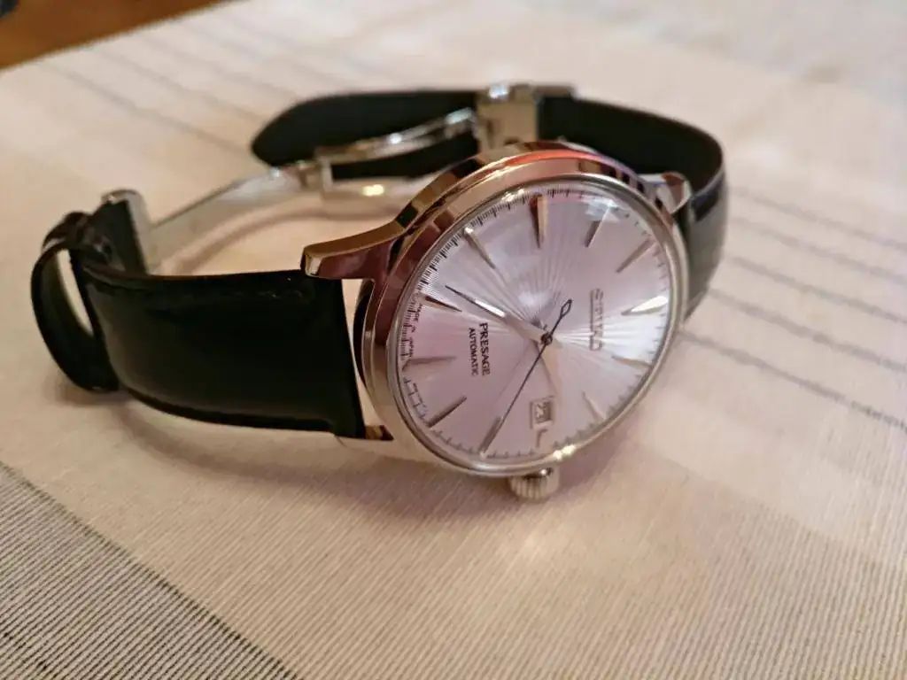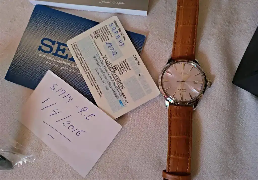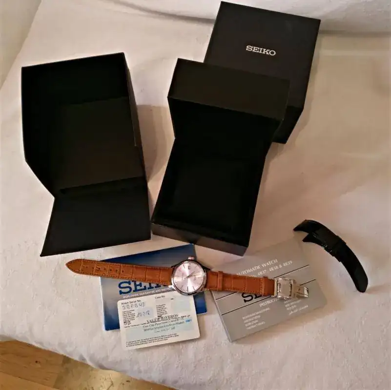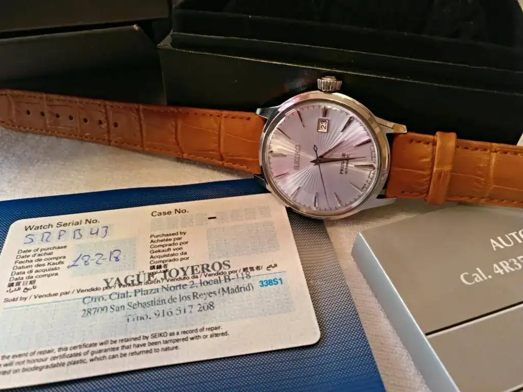 Hola a todos, pongo a la venta este precioso Seiko Presage Cocktail MADE IN JAPAN muy buscado, su dial tornasolado es blanco azulado con destellos violetas, ya lo conocéis todos, para mí el más bonito de la serie, correa de piel acharolada negra con pespunte azul impoluta, cierre deployante firmado, regalo la correa camel de las fotos (he puesto a la inversa dicha correa ya que se me hace más cómodo, pero está nueva, 2 puestas) marcha excelente, maquina 4r35b que admite carga manual y parada de segundero, el reloj tiene un mes y medio, muy nuevo, algún pelo que otro en las zonas pulidas y uno en el asa superior derecha, el cristal sin marcas, Garantía Nacional, estuche y lo que veis en las fotos.