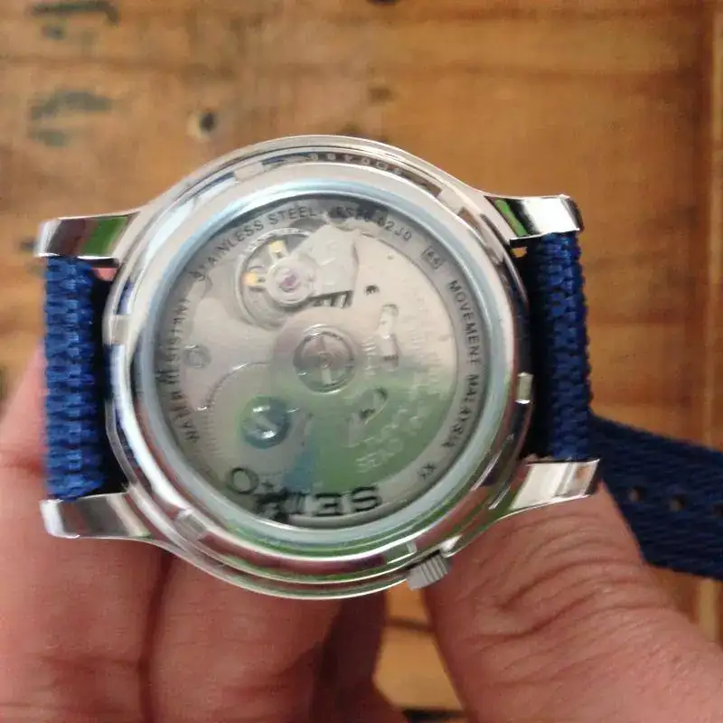 La caja es de acero arenado, con movimiento automático 7S26 de 21 joyas a la vista en la parte posterior. Delante lleva cristal hardlex de Seiko. Según las características es sumergible hasta 100m, aunque yo obviamente, no lo he comprobado