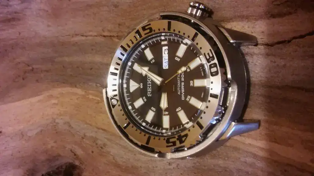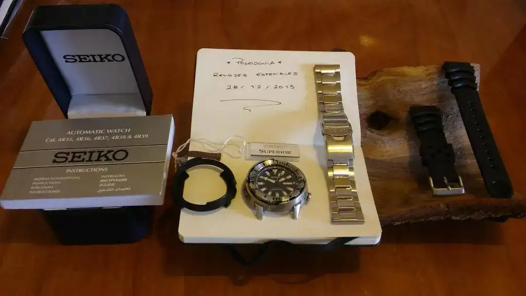 Además de con su armis de acero (que tiene los típicos pelillos en cierre) y el protector del bisel de caucho originales. Lo vendo con los extras de un protector de bisel de titanio en excelente estado (ver fotos) y una correa de caucho de SEIKO modelo z22 a estrenar. El cristal y su bisel están impolutos y la tapa presenta pequeños pelillos del uso pero nada destacable.