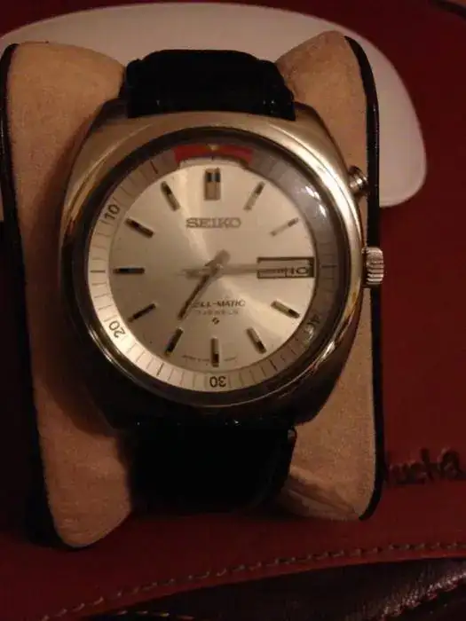 Este reloj de todos conocido, automático con alarma de carga manual. Un clásico de Seiko, a pesar de los añitos que ha cumplido, setentero el tío, su estado de marcha es bueno. De tamaño mas que aceptable, para una muñeca como la mía 18 cm.