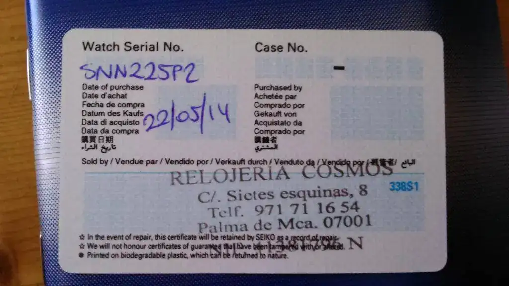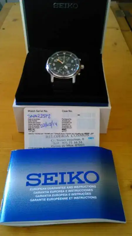 Lo envío con su caja original, documentación, y garantía fechada y sellada. El PVP es de 210€, yo pagué por él 190€, pero dado que la correa está modificada y ajustada, le pongo un precio de 75€ (envío incluido). Para este reloj no quiero cambios.