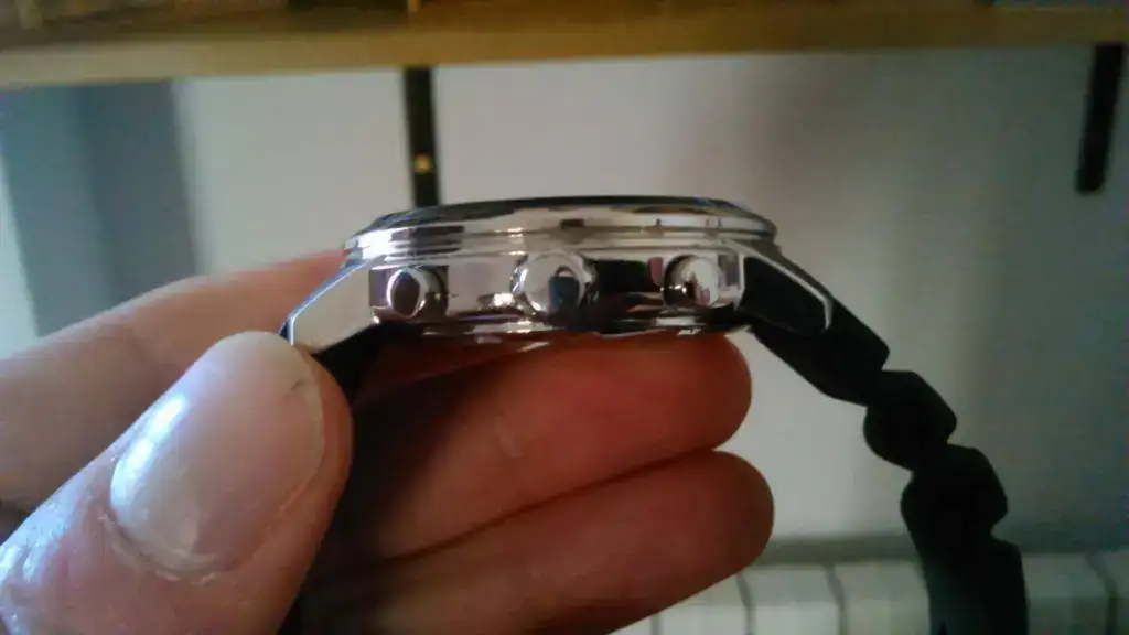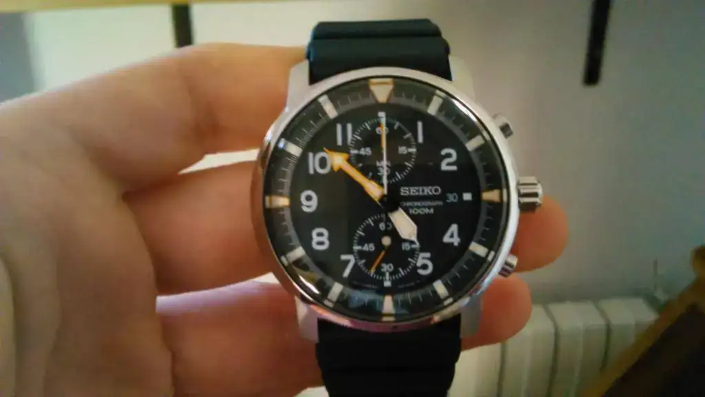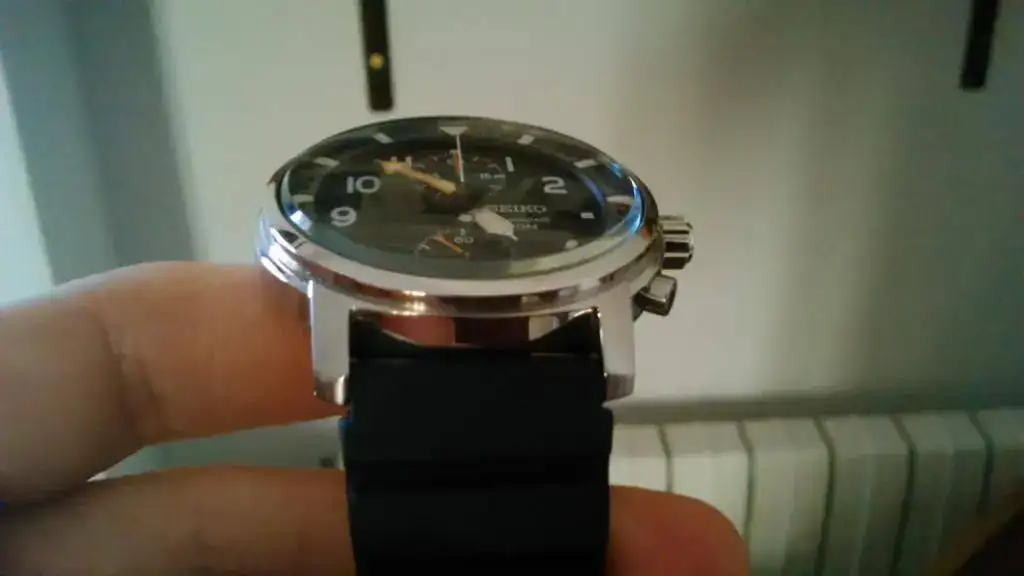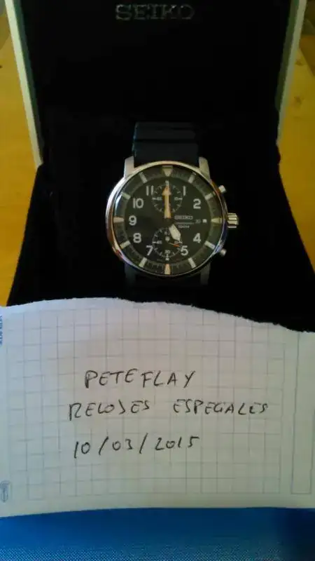 Siguiendo con las labores de "limpieza" de mi colección, pongo a la venta este Seiko Cronógrafo de cuarzo (SNN225P2), comprado en CO en mayo de 2014, por lo que aún tiene bastante garantía. Monta un movimiento cronógrafo de cuarzo, que creo que es el 7T92 de Seiko, el cual funciona perfectamente. La correa es de caucho y muy cómoda, aunque la recorté un poco ya que mi muñeca es bastante estrecha y me sobraba mucho. He intentado que se viera lo mejor posible en las fotos la "zona de corte", aunque con el reloj puesto no se nota para nada; también le hice un pequeño agujero adicional entre los dos últimos para ajustármelo mejor (soy muy tiquismiquis para eso). Sé que estas modificaciones de la correa quizás le quiten atractivo, pero en principio no pensaba venderlo.