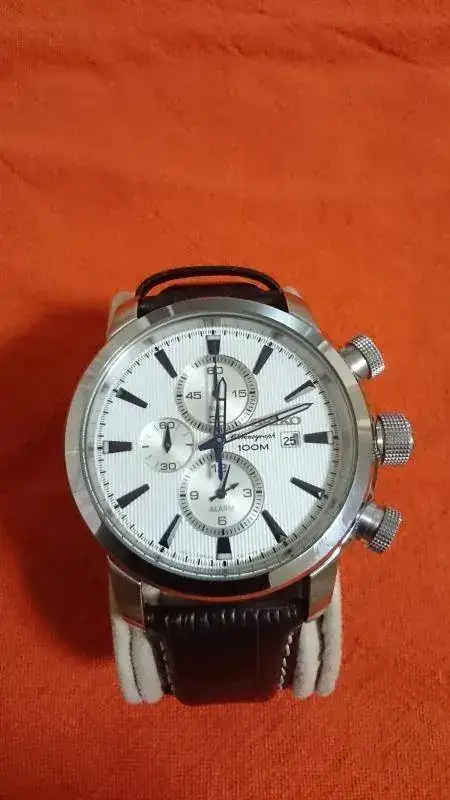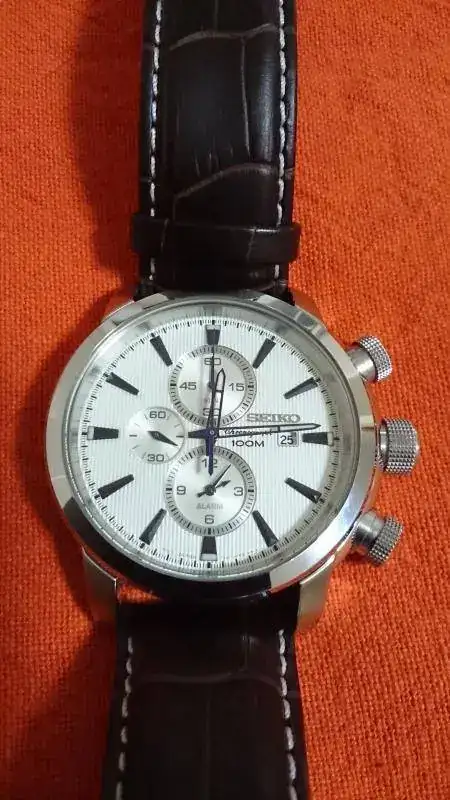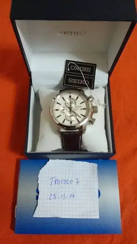 Saludos. Vendo este SEIKO crono en perfecto estado, estrenado el día 27/8/14 y con 4 puestas nada más. No tiene ni el más leve rasguño, ni pelo ni nada. La correa está al 95%, por decir algo. El segundero se mueve a saltos, como los automáticos. Es un reloj muy ponible y muy elegante. Lo que se ve sobre algunas partes de la caja son mis huellas o polvo. Garantía de dos años (21 meses por delante), caja exterior e interior y documentación.