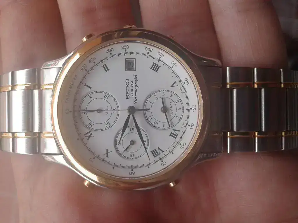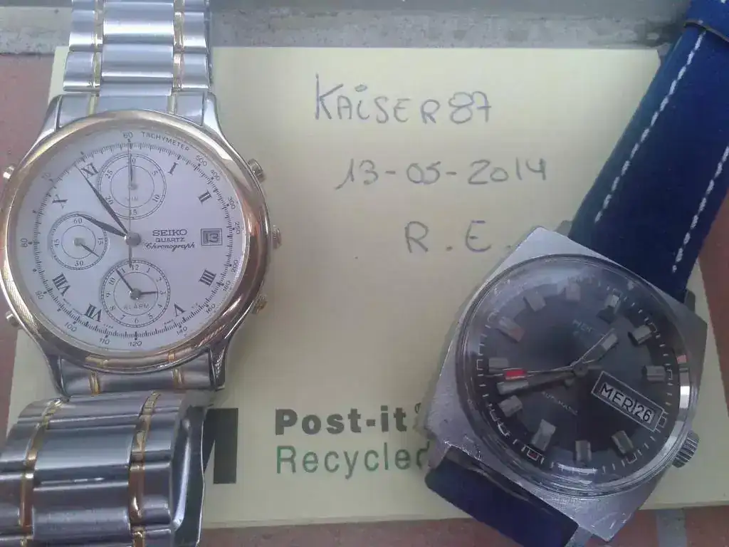 Vendo Seiko Crono cuarzo vintage calculo de unos 38-39 mm en muy muy buen estado para la tira de años que tendrá, el reloj funciona perfectamente y resetea correctamente, lo entrego con eslabones sobrantes. Además de regalo te doy un Herma Calipso auto vintage de 32mm pero parece mas grande puesto, recien revisada y aceitada la máquina y funcionando correctamente con doble calendario, el dia de la semana viene en francés y correa azul aterciopelada nueva. El Herma solo ahi que cambiarle el plexi al estar desquebrajado no he sabido sacarlo en la foto pero bueno un plexison 5 euretes y queda perfecto el reloj.